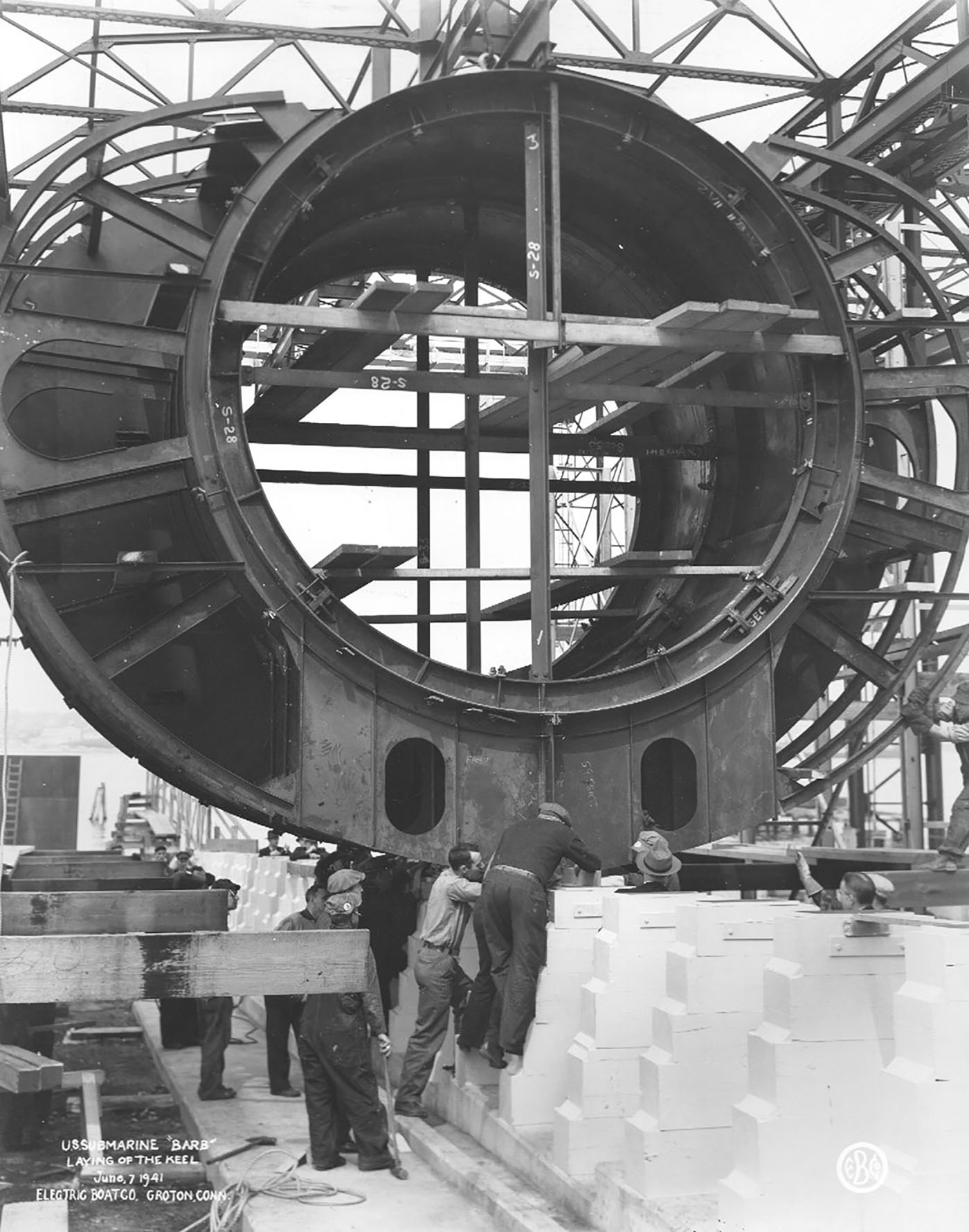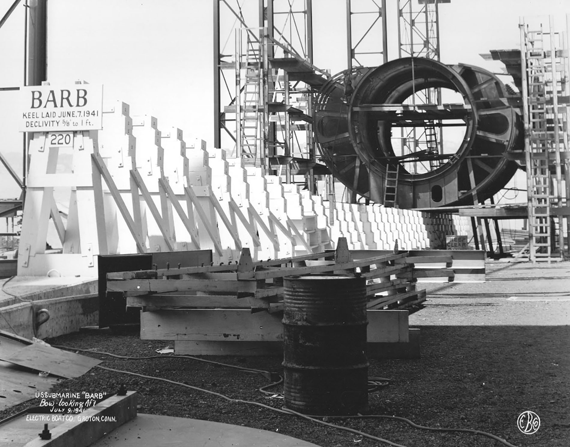 283k | Barb's (SS-220) keel is laid (and hull parts) on 7 June 1941. | Electric Boat photo # BS 30993 via NARA College Park, courtesy of Tracy White @ Researcher @ Large. | ||