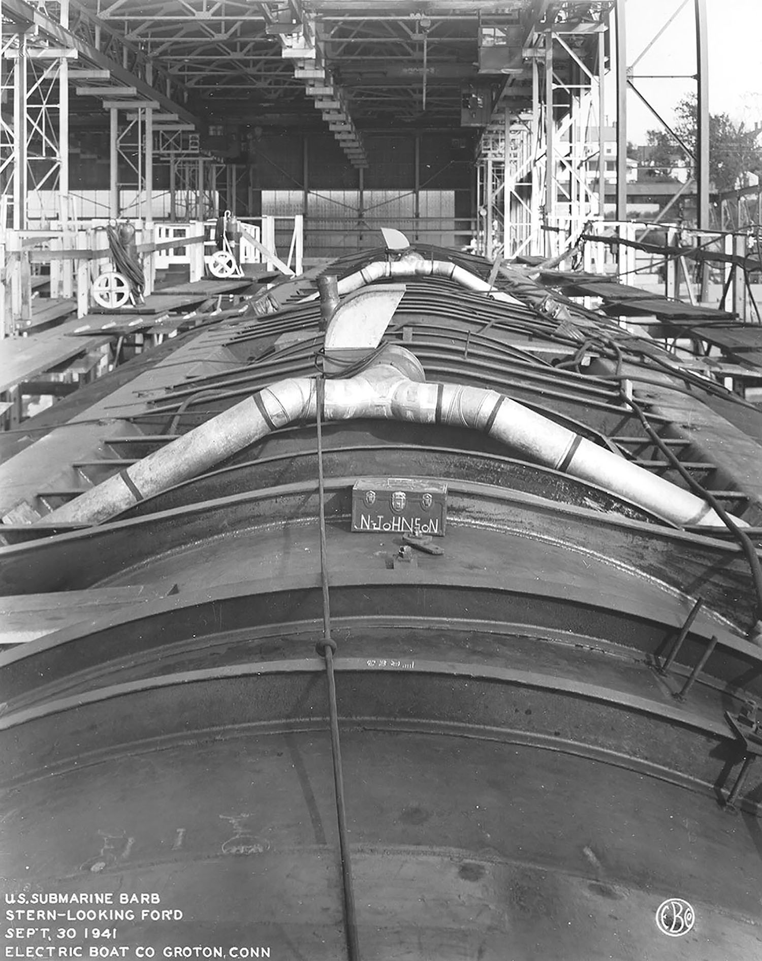 356k | N. Johnson worked on the hull of the Barb (SS-220), as is evidenced by this stern view looking forward on 30 September 1941. | Electric Boat photo # BS 30994 via NARA College Park, courtesy of Tracy White @ Researcher @ Large. | ||