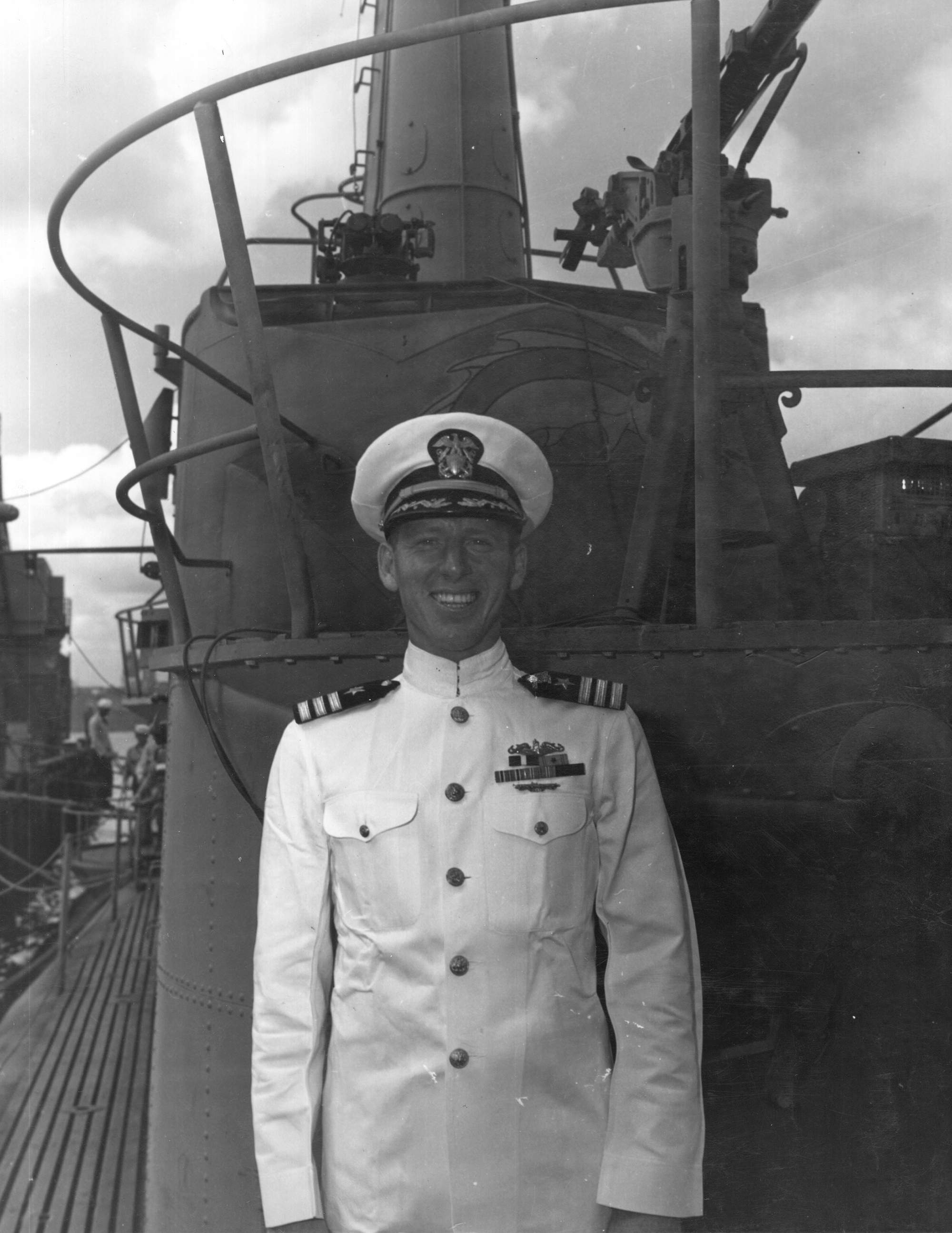 66k | Commander Eugene B. Fluckey, USN,Commanding Officer, Barb (SS-220) wearing the Navy Cross on board Barb after receiving the medal from Commander, Submarine Force, Pacific Fleet, 6 December 1944. Note Barb's insignia painted on her fairwater, behind Commander Fluckey. | Official USN photo # NH 103534, courtesy of USNHC & submitted by Robert Hurst. | ||
