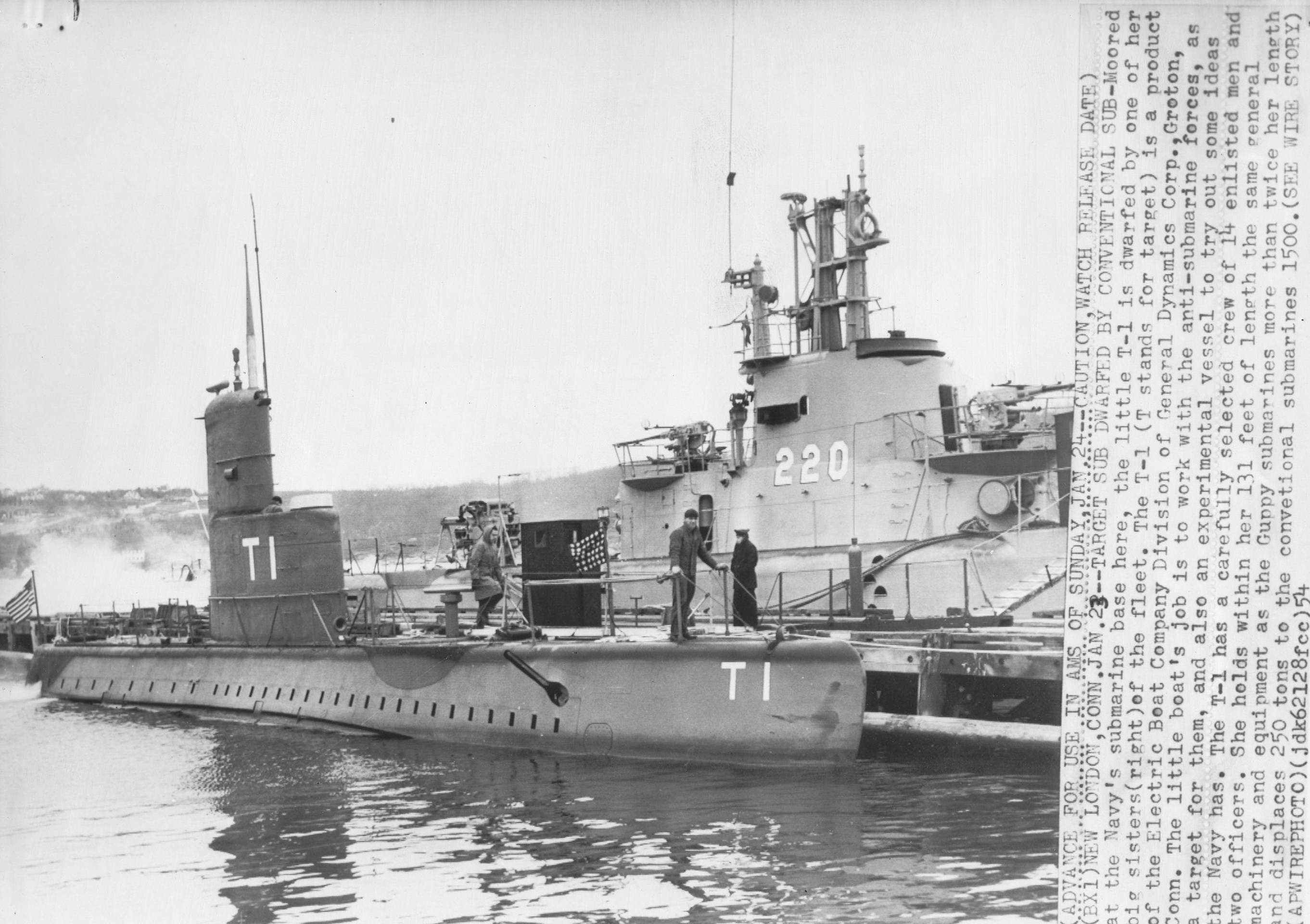 ![]() | 415k | New London, CT., 23 January 1954. Target sub dwarfed by conventional sub, Barb (SS-220) Moored at the Navy's submarine base here, the little T-1 (T stands for target) is a product of the Electric Boat Division, General Dynamics Corp, Groton CT. The little boats job is to work with the antisubmarine forces, as a target for them, and also as an experimental vessel, to try out some ideas the Navy has. The T-1 has a carefully selected crew of 14 enlisted men and two officers. She holds within her 131 feet of length the same general machinery and equipment as the GUPPY submarines more than twice her length and displaces 250 tons to the conventional submarines 1500. | AP Wirephoto courtesy of David Buell. | ||