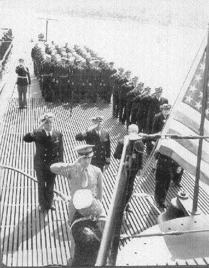 339k | The national ensign is raised on the flagstaff of Bonefish (SS-223) as her crew salutes during her commissioning ceremony, 31 May 1943. | USN photo courtesy of Wendy S. Gulley, Archivist, Submarine Force Museum, Naval Submarine Base NLON, Groton, CT. Photo enhancement courtesy of Tom Kermen. | |