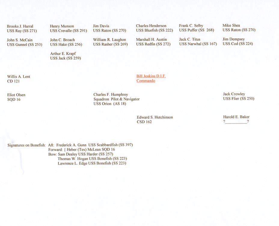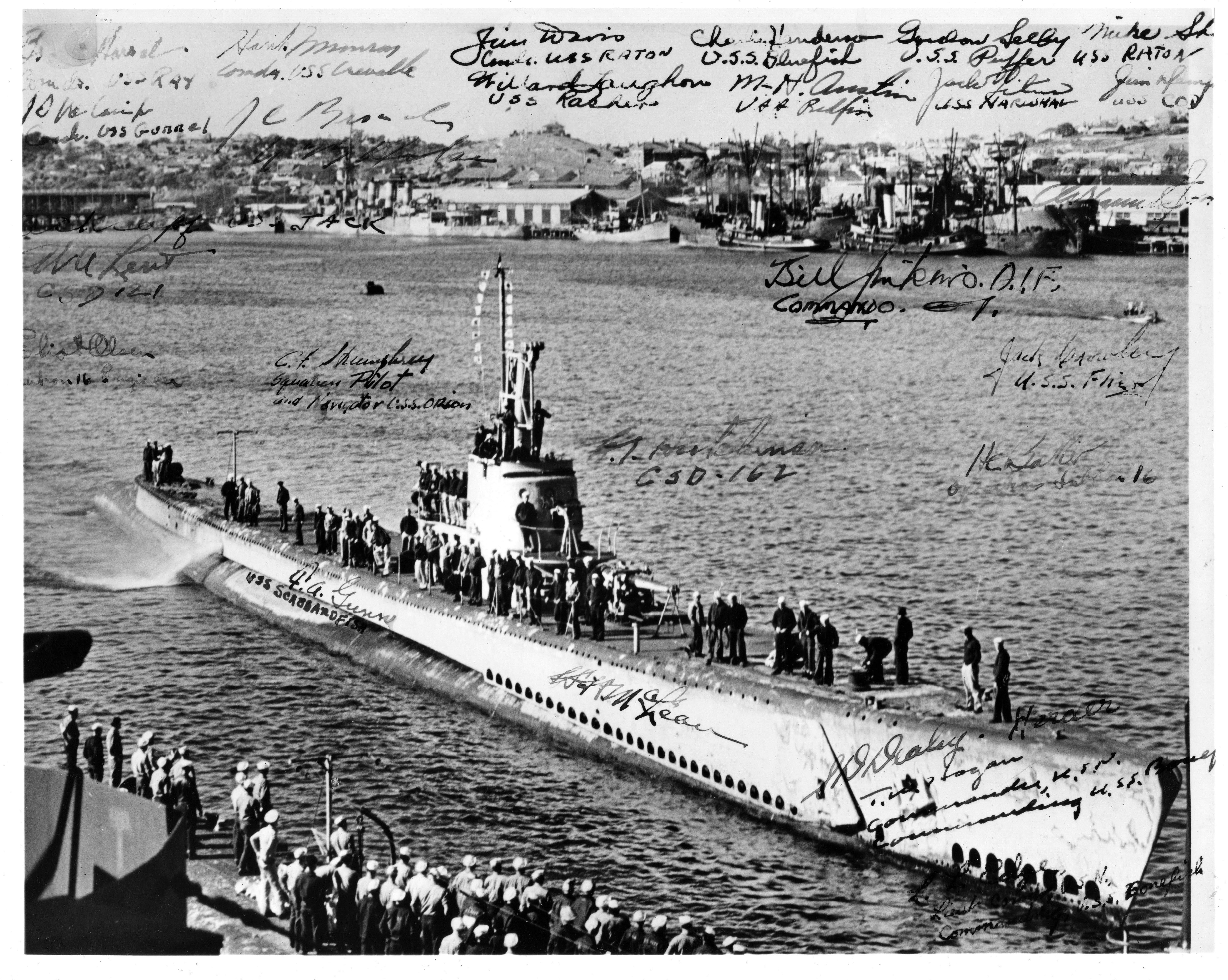 3.10k | Bonefish (SS-223) returning to the submarine base in Fremantle, Australia at the end of her 4th war patrol on 30 May 1944. The photo was signed between 30 May 1944 and 2 August 1944. I base the August date on the signature of Jack Crowley on the photo. He and Flier (SS-250) were lost on the patrol starting from Fremantle on 2 August 1944. An unsigned copy can be viewed here. | USN photo courtesy of Darryl L. Baker. | |