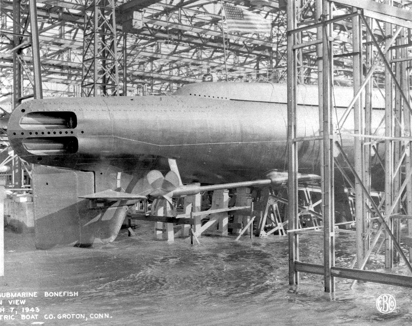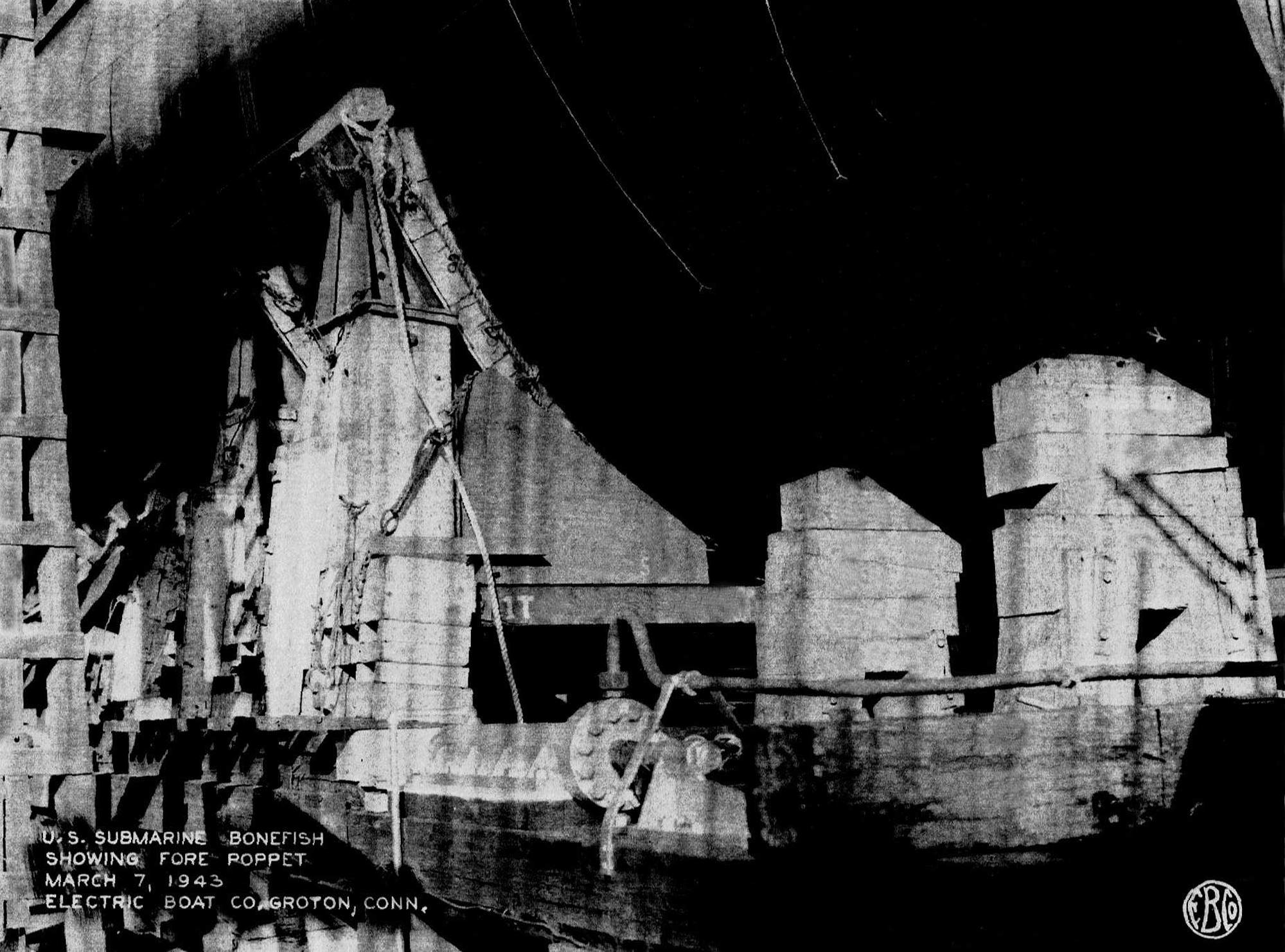 333k | Fore Poppet of the Bonefish (SS-223) shown before her launch at Electric Boat Co., Groton, CT. on 7 March 1943. | Electric Boat photo courtesy of Wendy S. Gulley, Archivist, Submarine Force Museum, Naval Submarine Base NLON, Groton, CT. Photo enhancement courtesy of Tom Kermen. | |