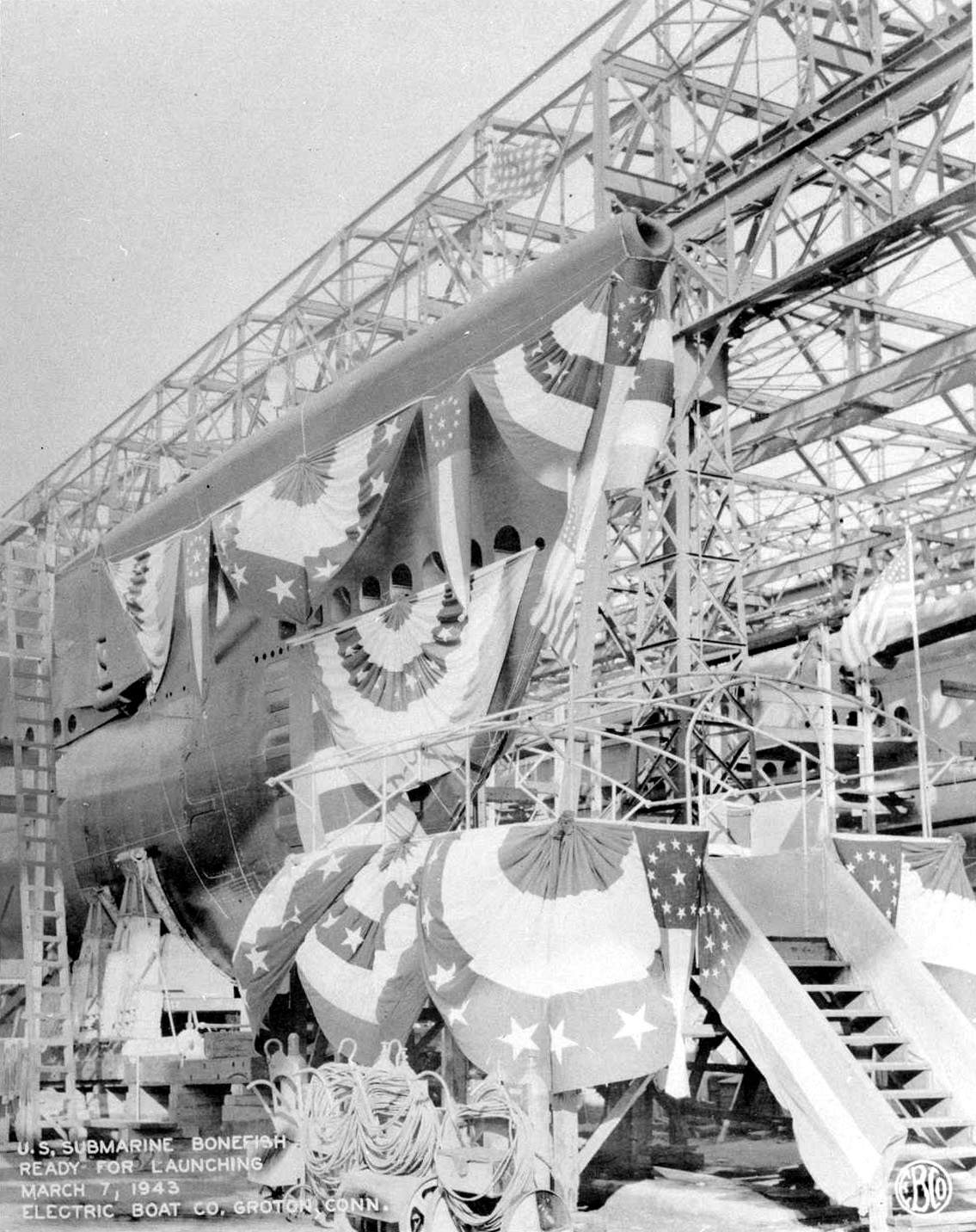 244k | Flag draped bow view of the Bonefish (SS-223) just prior to her launching on the building ways at the Electric Boat Co., Groton, CT., 7 March 1943. | Electric Boat Co/ USN photo courtesy of ussubvetsofworldwarii.org | |