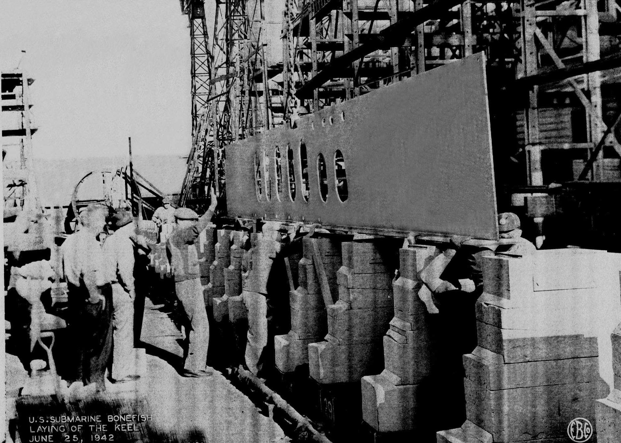 408k | Keel of the Bonefish (SS-223) being laid on 25 June 1942, at the Electric Boat Co., Groton, CT. | Electric Boat photo courtesy of Wendy S. Gulley, Archivist, Submarine Force Museum, Naval Submarine Base NLON, Groton, CT. Photo enhancement courtesy of Tom Kermen. | |