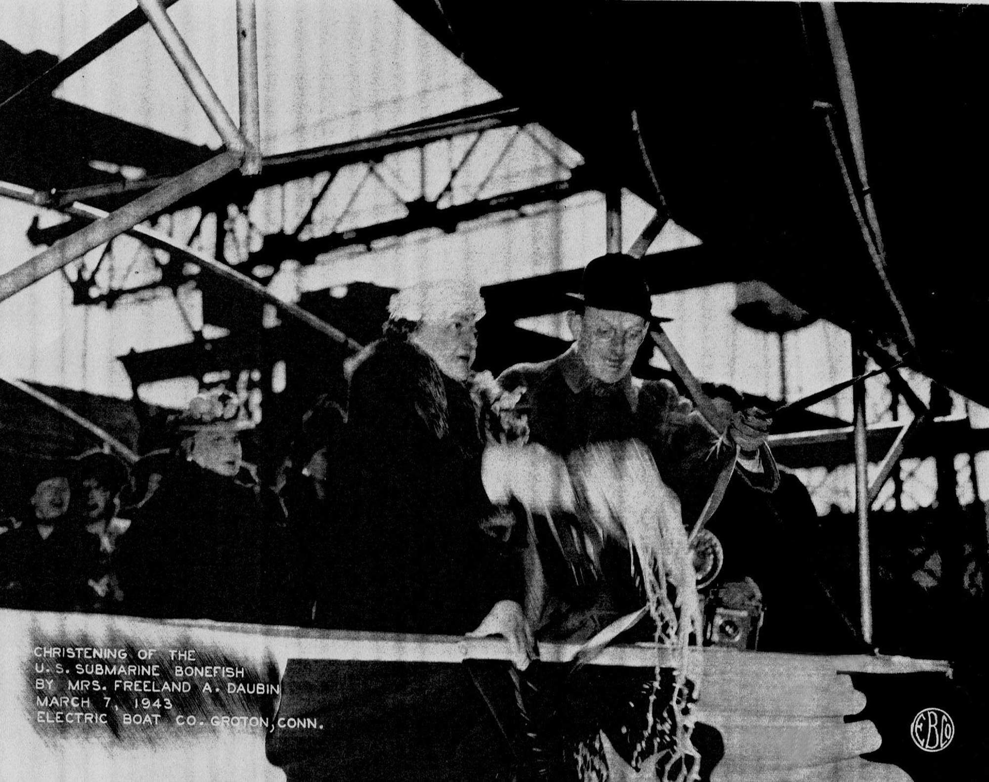 372k | Mrs. Elizabeth Scott Daubin and her bouquet of flowers await the launch of the Bonefish (SS-223) at Electric Boat Co., Groton, CT. on 7 March 1943. | Electric Boat photo courtesy of Wendy S. Gulley, Archivist, Submarine Force Museum, Naval Submarine Base NLON, Groton, CT. Photo enhancement courtesy of Tom Kermen. | |