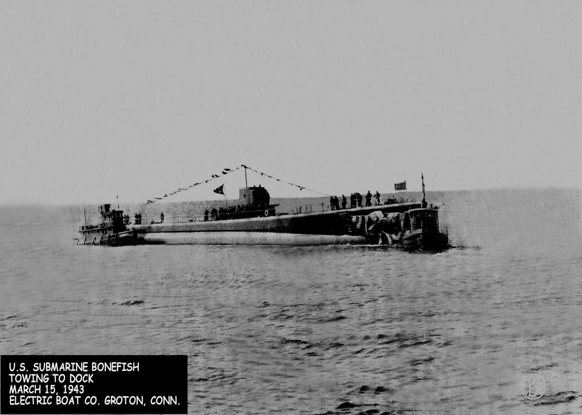227k | Bonefish (SS-223) is towed to dock on 15 March 1943. | Electric Boat photo courtesy of Wendy S. Gulley, Archivist, Submarine Force Museum, Naval Submarine Base NLON, Groton, CT. Photo enhancement courtesy of Tom Kermen. | |