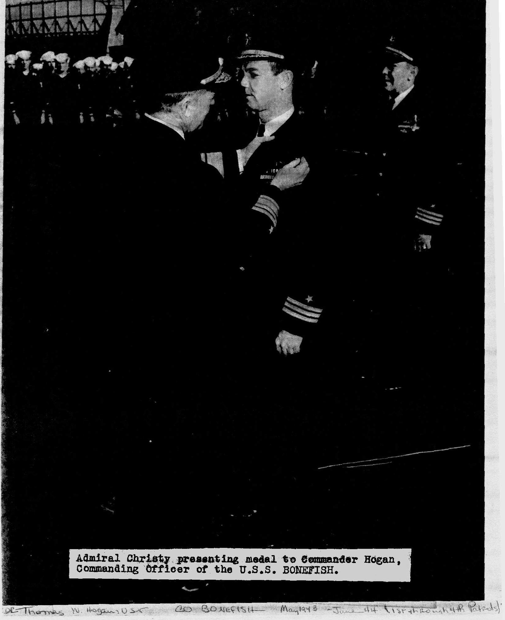 164k | Admiral Christy presenting a medal to Commander Thomas Wesley Hogan of the Bonefish (SS-223). | USN photo courtesy of Wendy S. Gulley, Archivist, Submarine Force Museum, Naval Submarine Base NLON, Groton, CT. Photo enhancement courtesy of Tom Kermen. | |