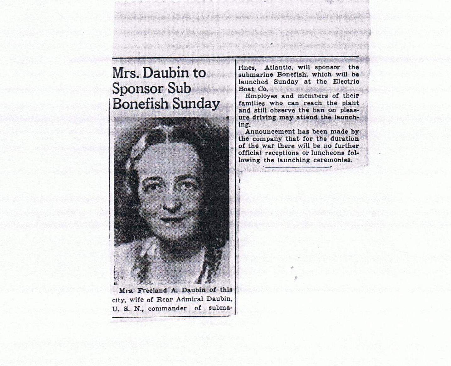 195k | Mrs. Daubin to Sponsor Sub Bonefish (SS-223) Sunday. | Electric Boat photo courtesy of Wendy S. Gulley, Archivist, Submarine Force Museum, Naval Submarine Base NLON, Groton, CT. | |