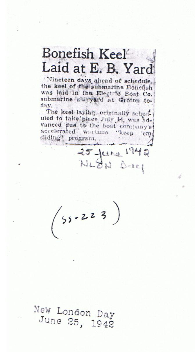 376k | Sub Bonefish (SS-223) Launched at Electric Boat Yard; Second Launching in Two Weeks. | New London Day, 8 March 1943 photo courtesy of Wendy S. Gulley, Archivist, Submarine Force Museum, Naval Submarine Base NLON, Groton, CT. | |