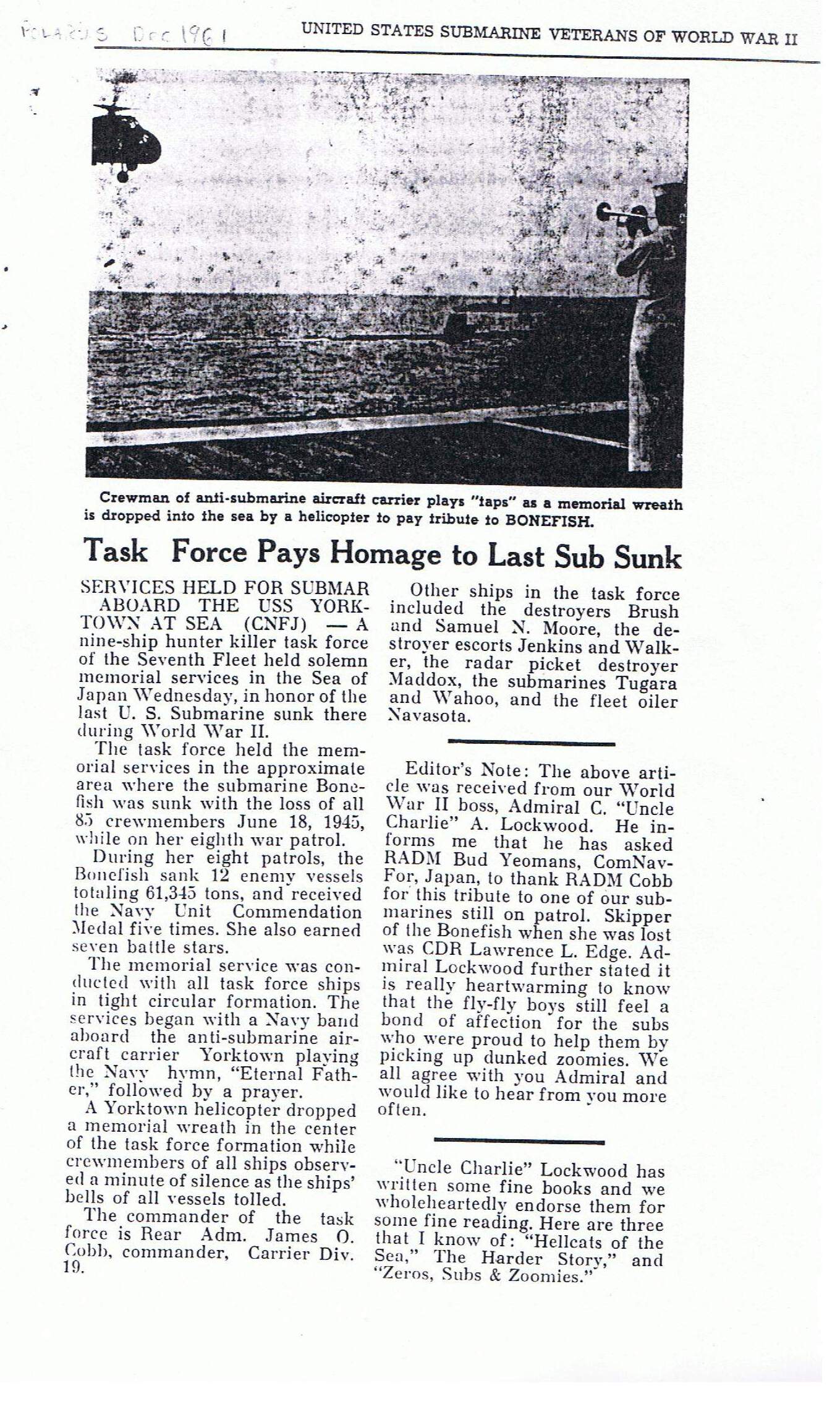 284k | Memorial wreath being laid over the site of the Bonefish (SS-223), on the west coast of Honshu by the crew of the Yorktown (CVA-10), 29 September 1961. In Memorium: In the Second Book of Shmuel (Samuel), 22nd chapter, 5th through the 20th verses, translated from the original in Hebrew and published by the Koren Publishers of Jerusalem, Israel, 1982, can perhaps aptly describe the fate of the crew and all other U.S. submariners who died defending their county: "When the waves of death compassed me / the floods of ungodly men made me afraid; / the bonds of She'ol encircled me; / the snares of death took me by surprise; / in my distress I called upon the Lord, / and cried to my G-D: / and he heard my voice out of his temple, / and my cry entered into his ears. / Then the earth shook and trembled; /the foundations of heaven moved / and shook because of his anger /...the heavy mass of waters, and thick clouds of the skies /... And the channels of the sea appeared, / the foundations of the world were laid bare, / at the rebuking of the Lord, at the blast at the breath of his nostrils. / He sent from above, he took me; / he drew me out of many waters; / he delivered me from my strong enemy, and from those who hated me; for they were too strong for me. / They surprised me in the day of my calamity: / but the Lord was my stay / He brought me forth also into a large place: / he delivered me because he delighted in me./" |