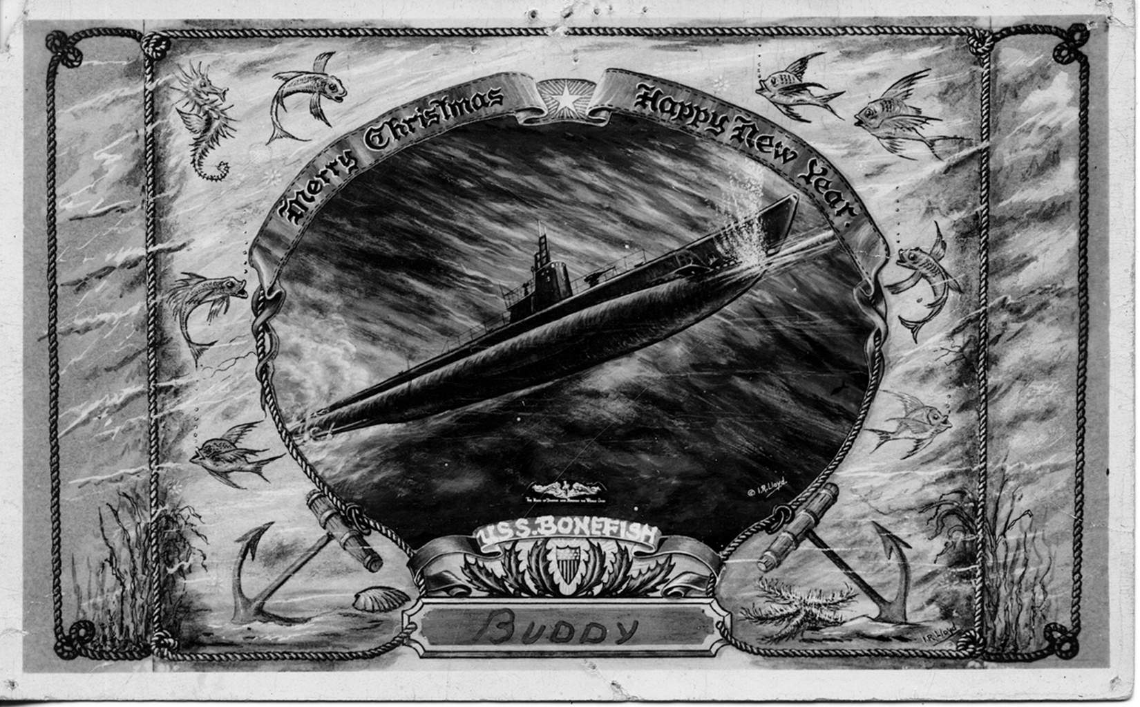 273k | Bonefish (SS-223) Xmas Post card oil painting by Lloyds of Vallejo Art Studio. | USN photo courtesy of Mr. William "Randy" Everett (nephew) of McMM1c H. Vernon Miles, plankowner of the Bonefish (SS-223), K.I.A.. with the rest of the 84 man crew of the Bonefish. | |