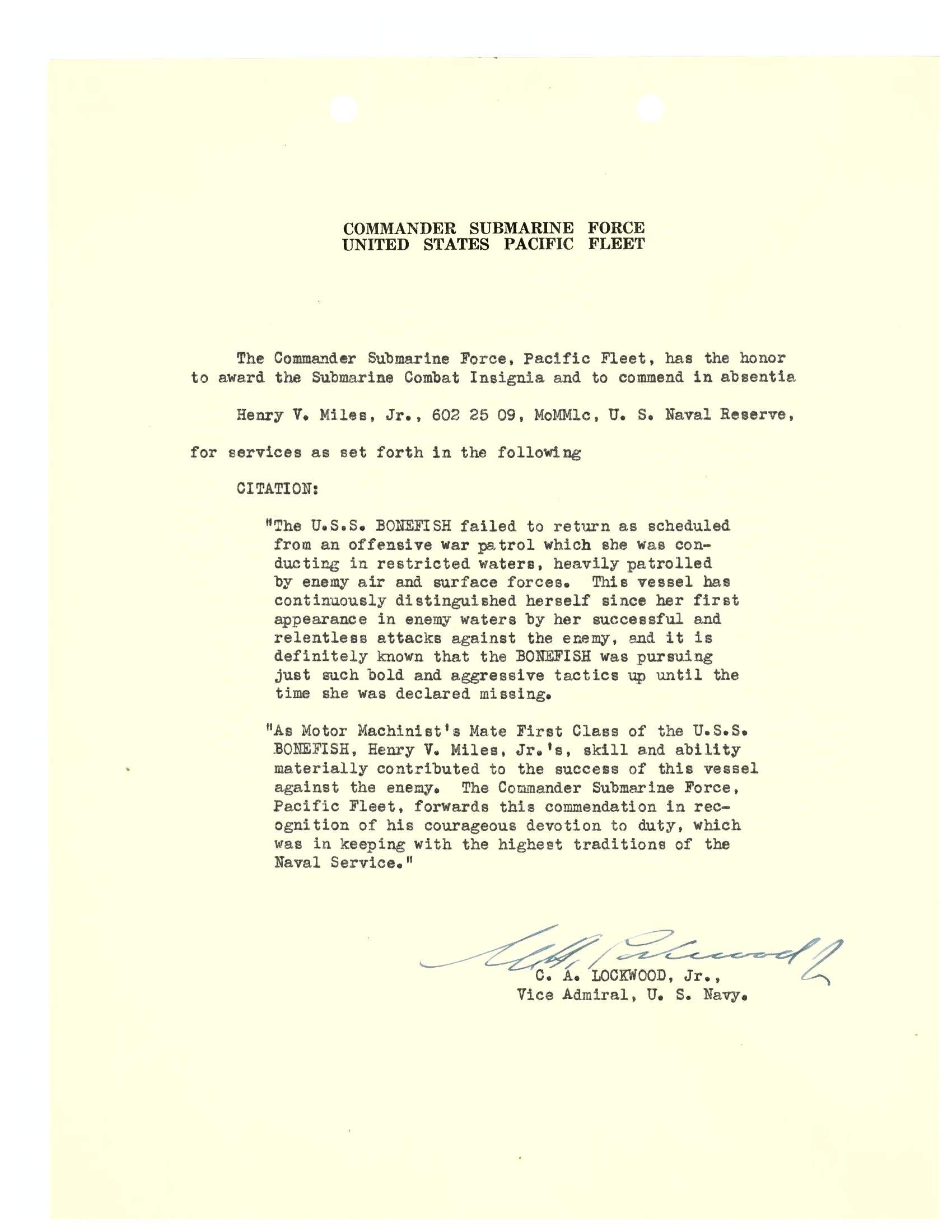 ![]() 0828330 | 2.54k | Let all men who read this scroll be forever grateful and respectful of those heroic American submariners who went in and especially to those who gave their lives in this operation. The job was superlatively well done. Chas Lockwood Vice Admiral This was Operation Barney | Operation Barney link courtesy of Steven Trent Smith, World War II Magazine via navytimes.com Photo courtesy of the family of Charles H Wagner Jr., TM2c (SS) USNR. Service from 1942-1946, aged 18-22, aboard S-37 (SS-142) & Tinosa (patrols 6-12). | |