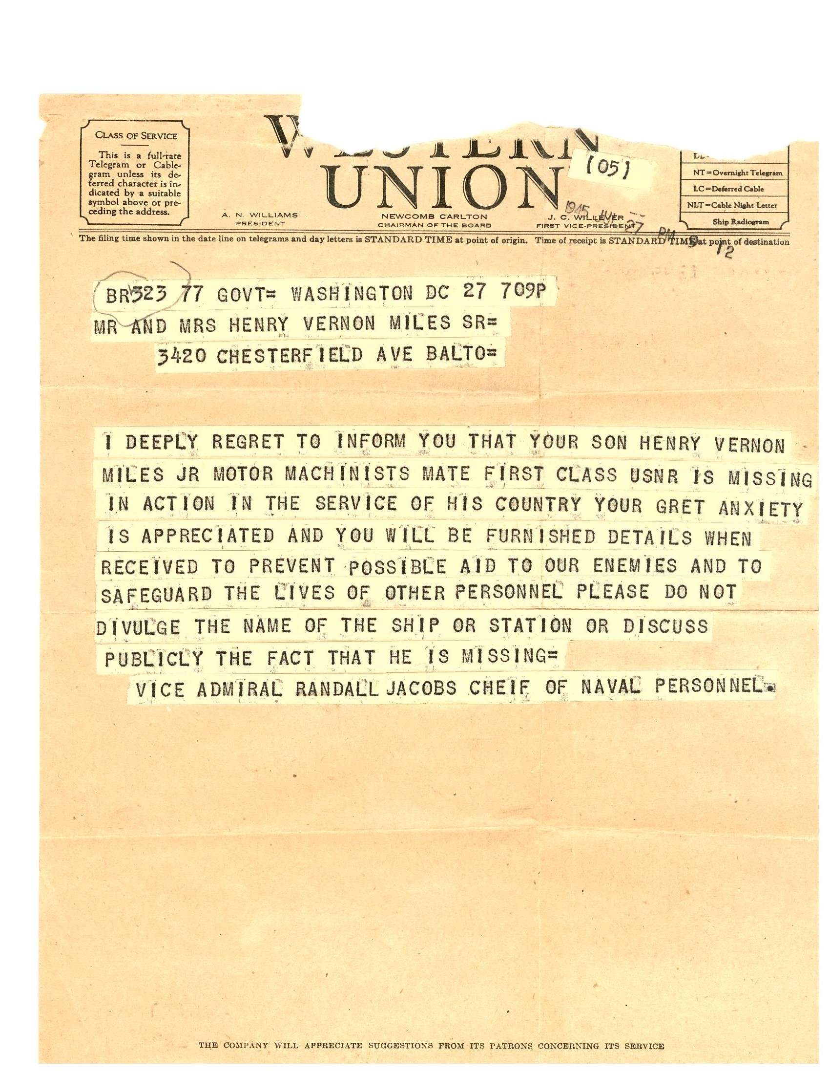 641k | Western Union telegram dated 28 July 1945 informing Mrs. Sarah Simms Edge that her husband, Lawrence Lott Edge, Commander of the Bonefish (SS-223) is M.I.A. | USN photo courtesy of Sarah E. Shuler (daughter) & Lawrence L. Edge Jr. (son) of Lawrence Lott Edge, CO of the Bonefish K.I.A. with the rest of the 84 man crew of the Bonefish. | |
