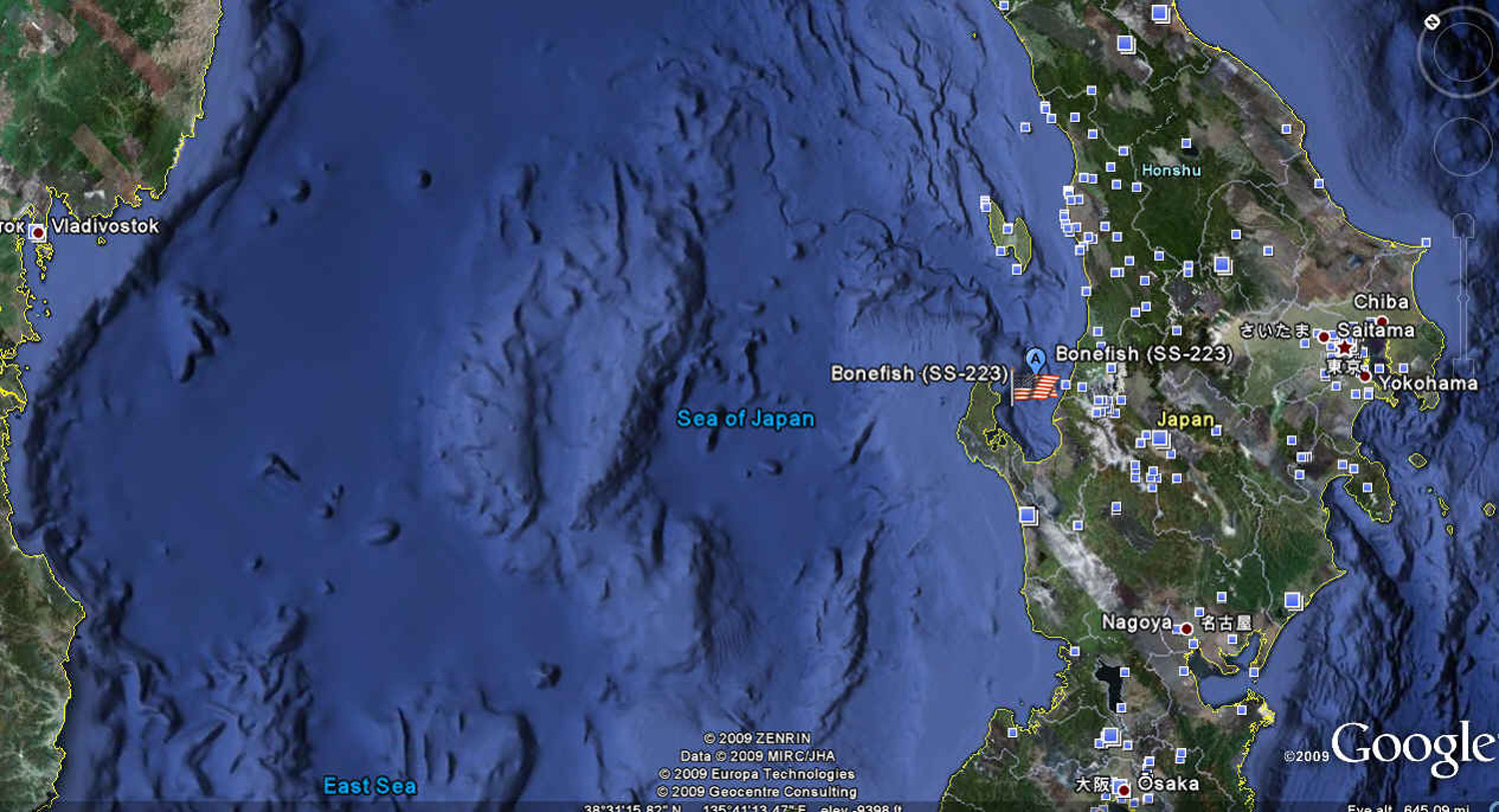66k | Google Earth satellite photo of Toyoma Wan, Bonefish's (SS-223) last approximate position based during post-war debriefings. This position is thought to be the final resting place of the Bonefish and her crew. | View courtesy of Google Earth. | |