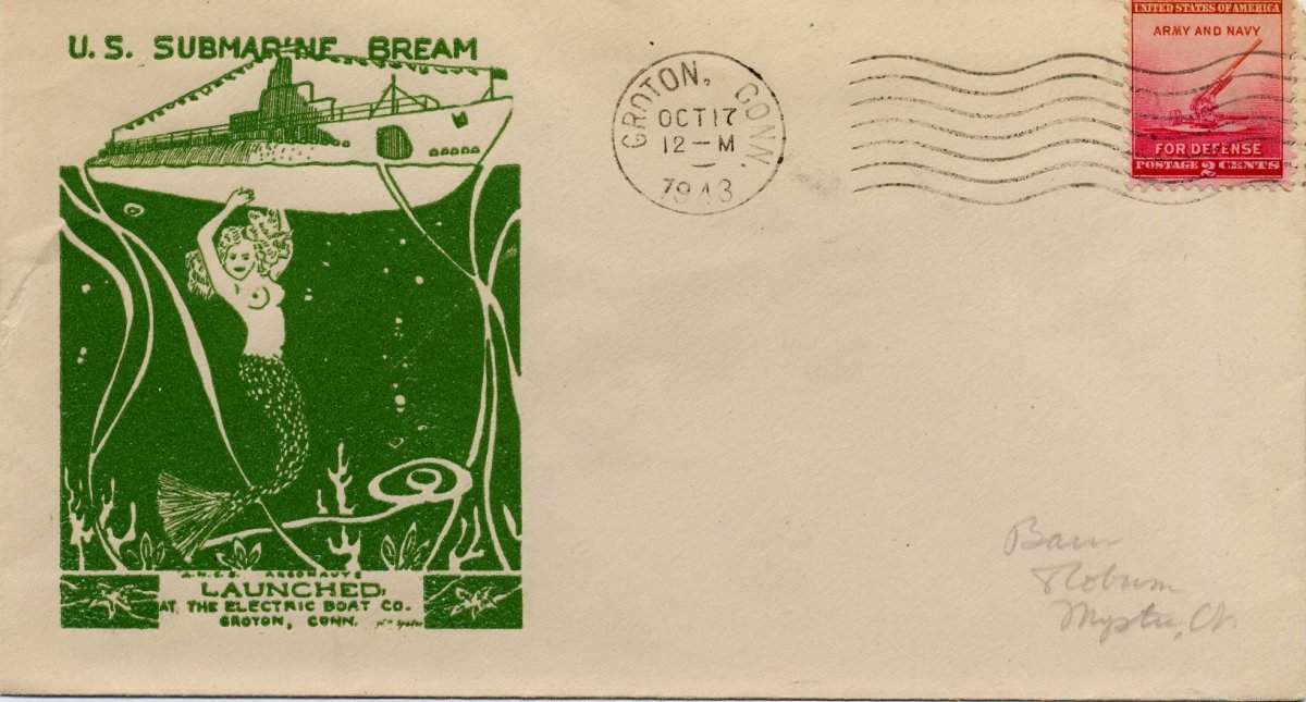 21k | Commemorative post mark on the occasion of the launching of the Bream (SS-243) at Electric Boat on 17 October 1943. | Courtesy of Jack Treutle (of blessed memory). | |