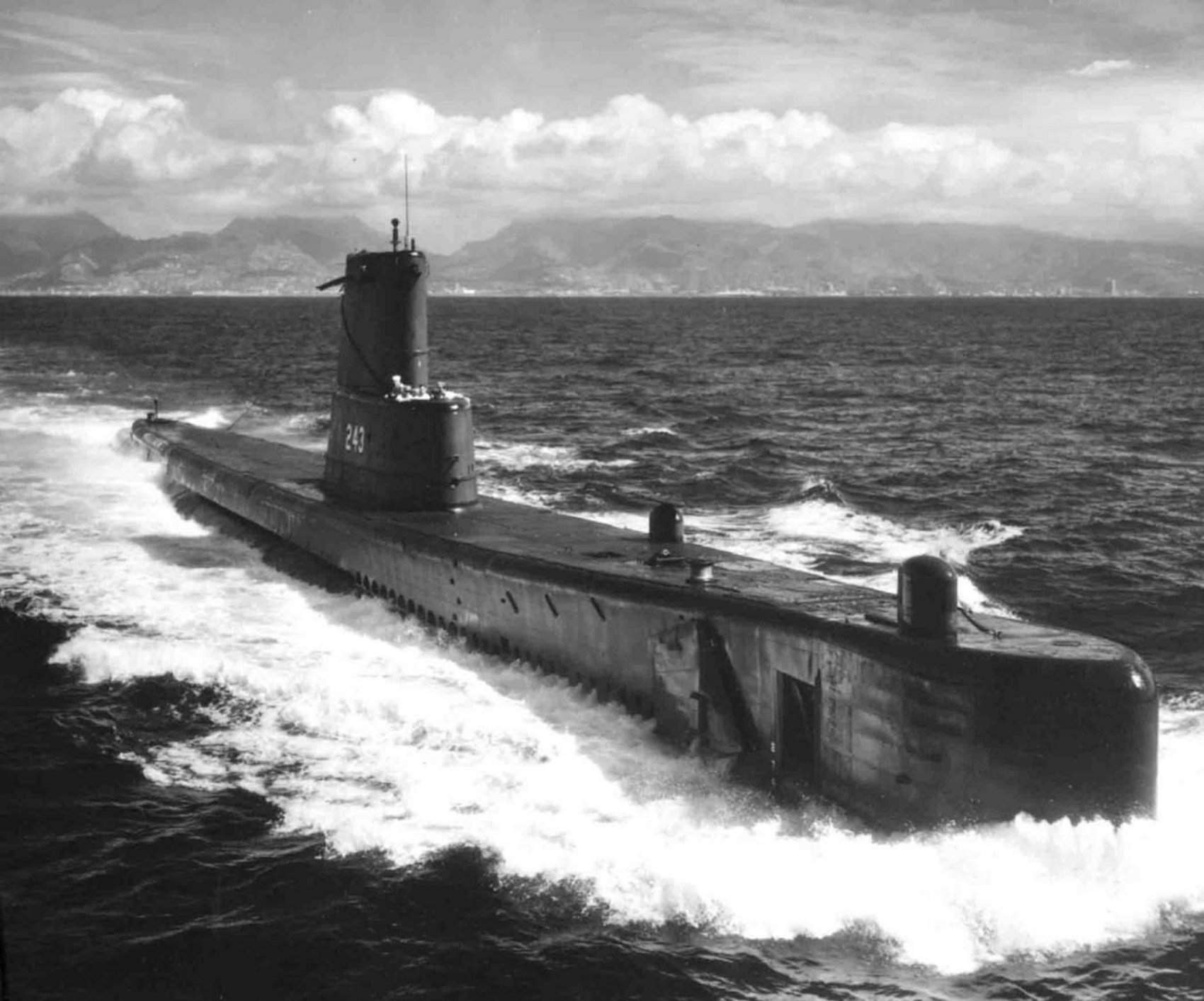 111k | Bashaw (SSK-241), with Bream (SSK-243), Segundo (SS-398), Razorback (SS-394), and Menhaden (SS-377), in San Diego Harbor, circa 1953. | Courtesy of Phil Gulick, former 1st Amphib Recon Company member aboard the Perch (SS-313). | |