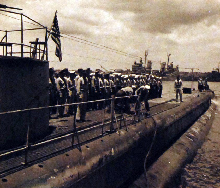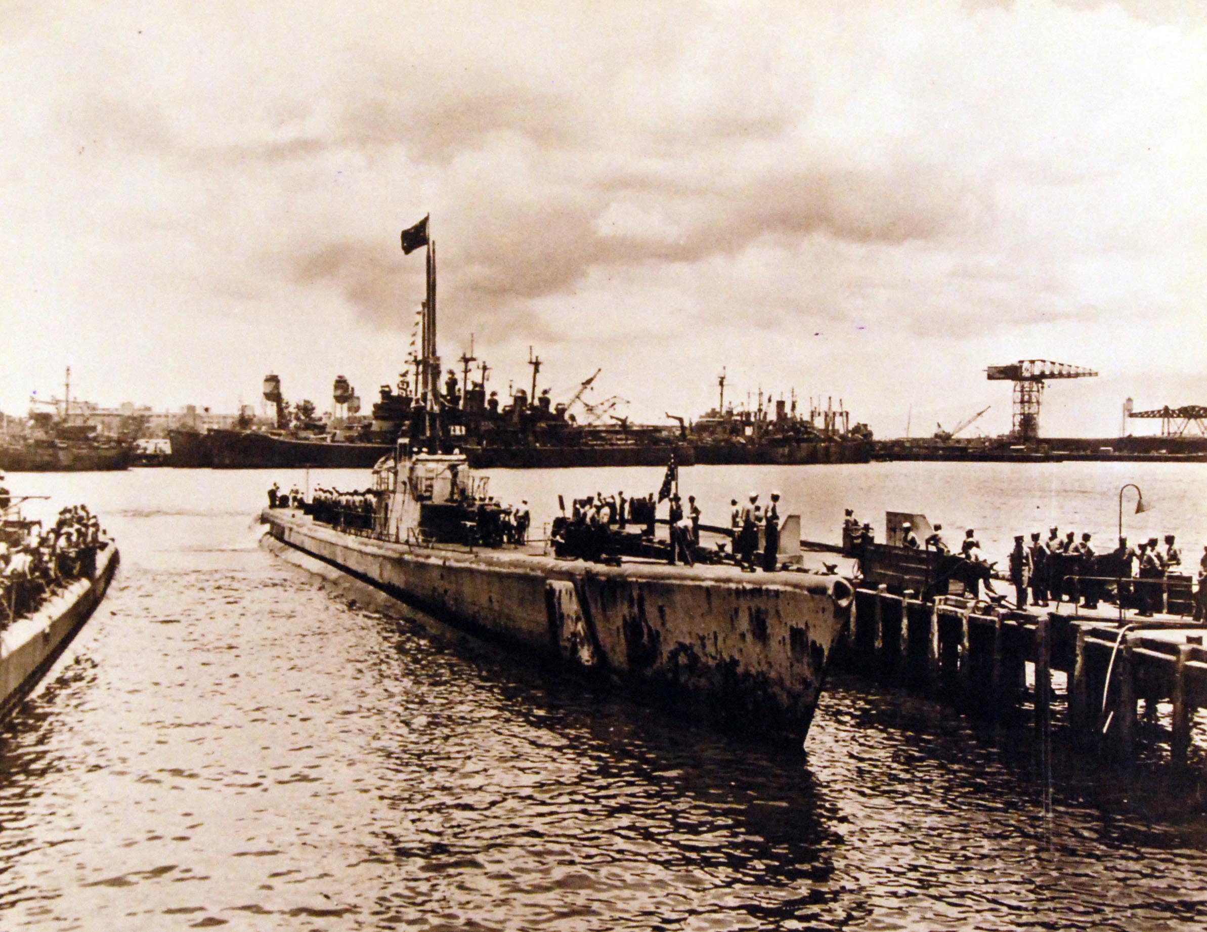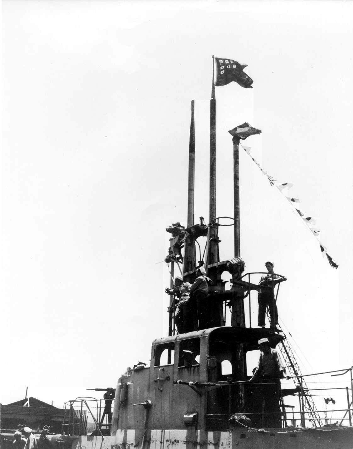 291k | Bream (SS-243) entering Pearl Harbor after a successful war patrol, 15 June 1945. | Photograph # 80-G-325193, by Photographer's Mate First Class L. Strawger, now in the collections of the National Archives, courtesy of National Museum of the U.S. Navy via flickr.com. | |