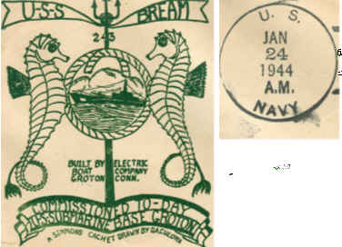 17k | Commemorative post mark on the occasion of the commissioning of the Bream (SS-243) at Electric Boat on 24 January 1944. | Courtesy of Ken Zirkle. | |
