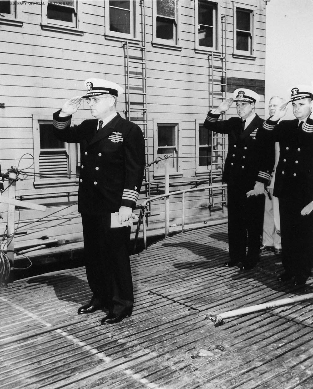 162k | Capt. W. A. Lent, Commander of Pacific Reserve Fleet Mare Island, renders a salute during the re-commissioning ceremonies of Bream (SS-243) at Mare Island on 5 June 1951. LCDR R. F. Reilly (not shown) assumed command of the submarine. | USN photo # 9476-6-51, courtesy of Darryl L. Baker. | |