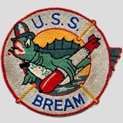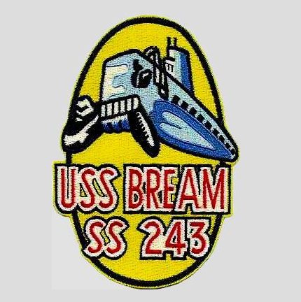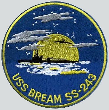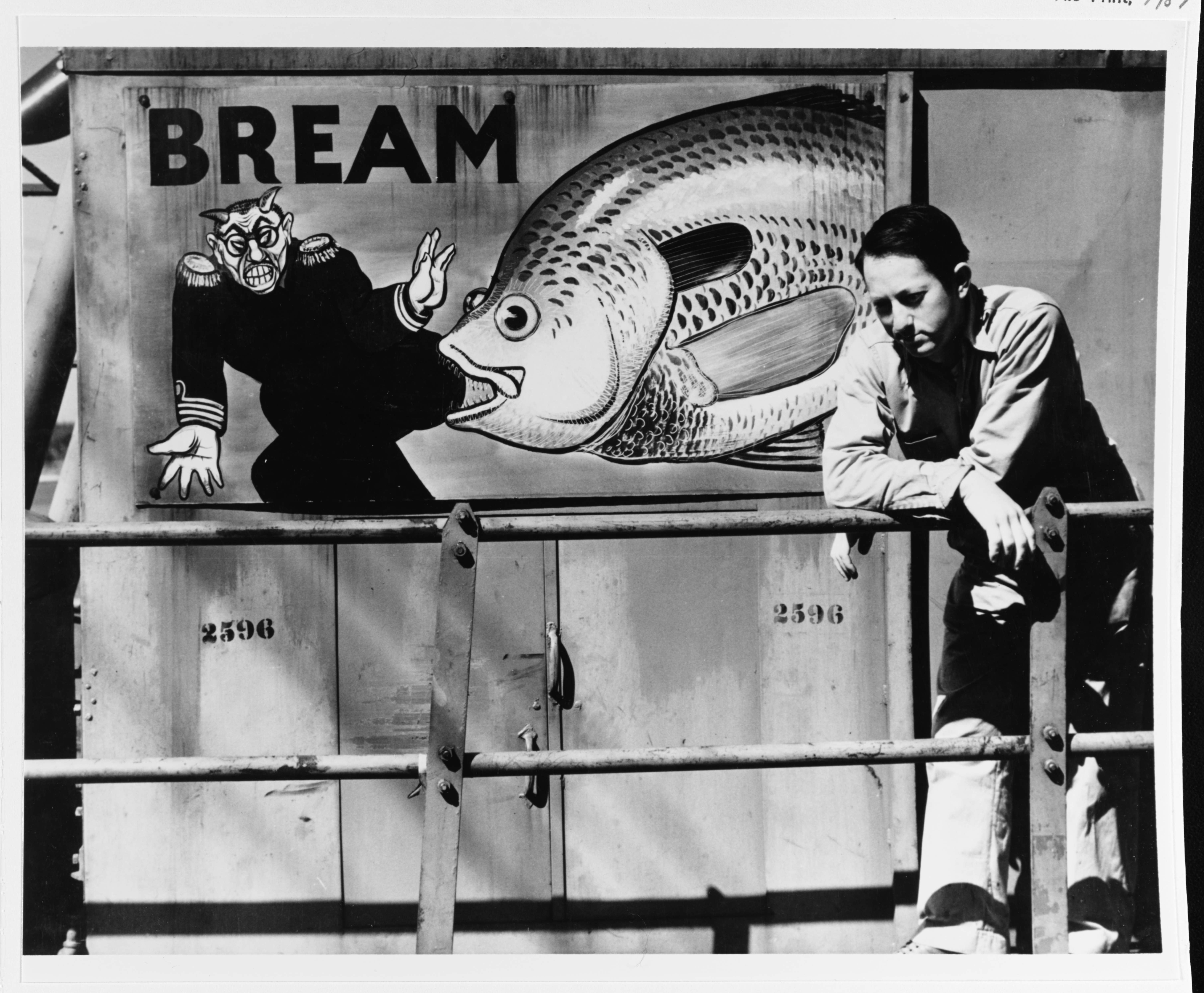 1.28k | Bream (SS-243) Insignia, showing a fish nipping at a horned Japanese admiral. Photographed by Lieutenant Commander Charles Jacobs, USN, on 14 August 1943, at her builders' yard, the Electric Boat Co., Groton, Connecticut. | USN photo 80-G-468313 courtesy of history.navy.mil | |