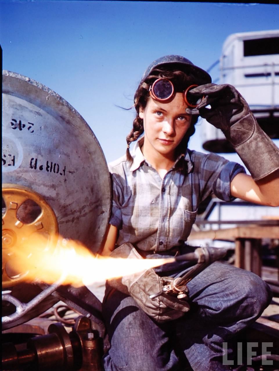 131k | Forward escape hatch for the Bream (SS-243) is inscribed on the open hatch in front of the lady worker with the acetylene torch. | Photo from the Photo Essay How To Build A Submarine at Electric Boat Co. New London, Conn. Photographer: Bernard Hoffman, courtesy of life.time. |