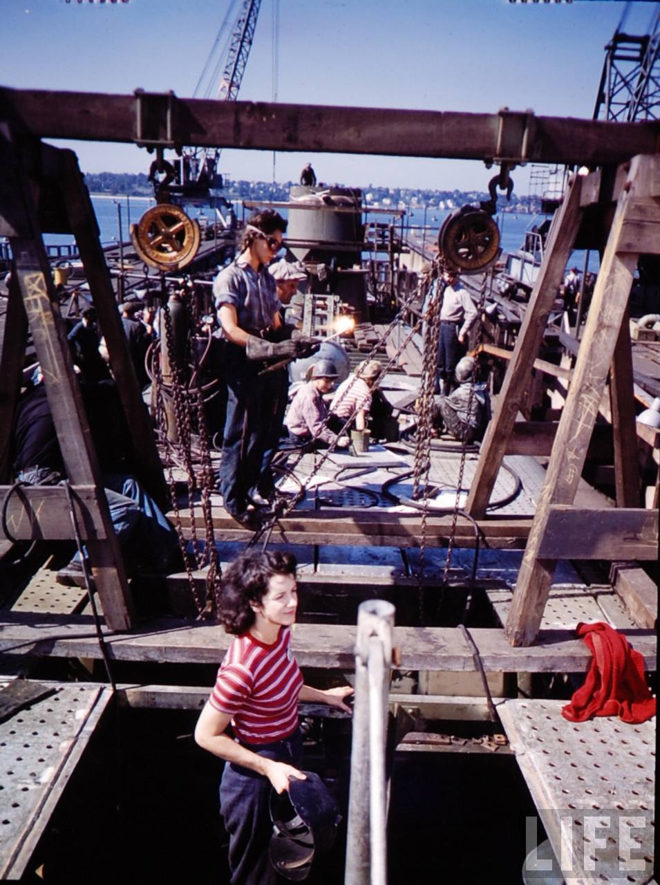 172k | Stepping back a few feet to view the work scene on the Bream (SS-243) under construction during the summer of 1943. | Photo from the Photo Essay How To Build A Submarine at Electric Boat Co. New London, Conn. Photographer: Bernard Hoffman, courtesy of life.time. |