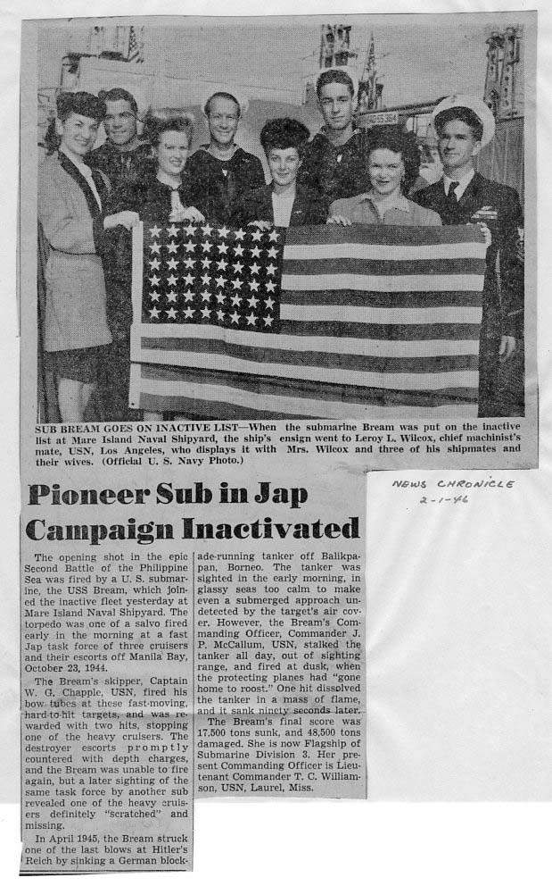 125k | News clipping from the Vallejo News Chronicle of 1 February 1946 covering the decommissioning of the Bream (SS-243) at Mare Island on 31 January 1946. | Courtesy of Darryl L. Baker. | |