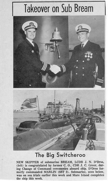 80k | News clipping from Mare Island's newspaper of 2 July 1965 covering the change of command of the Bream (AGSS-243). | Courtesy of Darryl L. Baker. | |