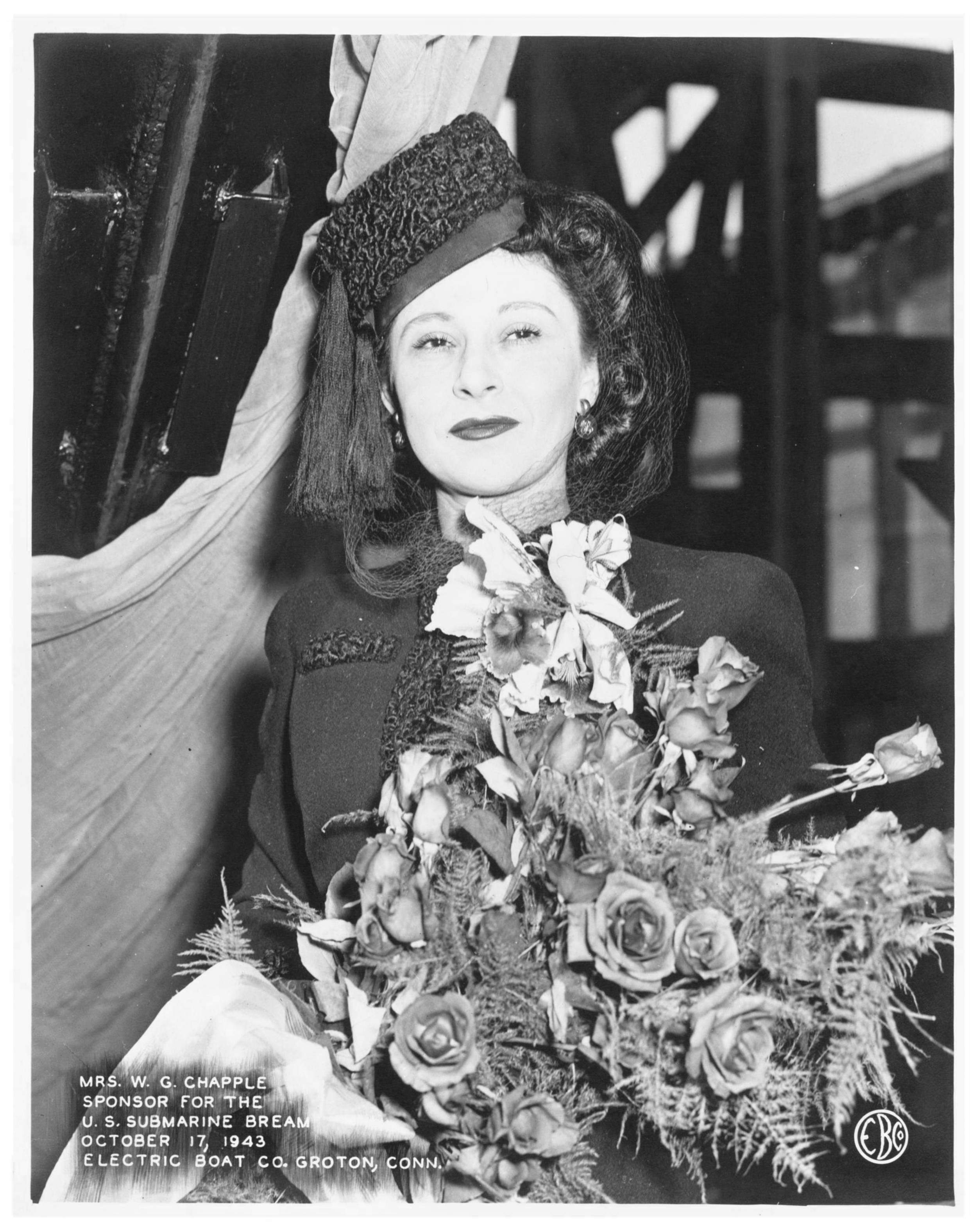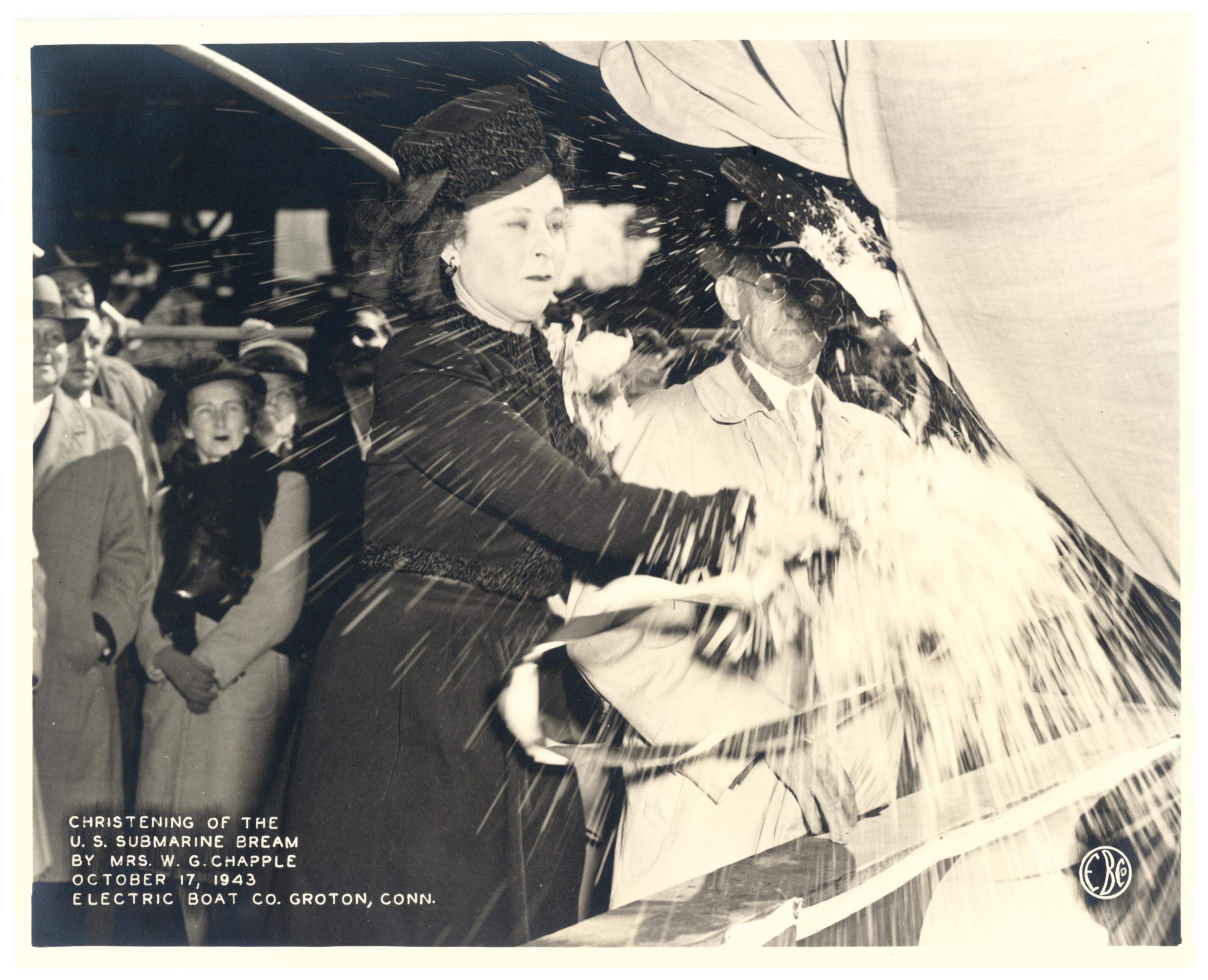 2.95k | Mrs. Wreford G. Chapple is indeed a very striking woman: Christening of the Bream (SS-243), 17 October 1943. | Electric Boat / USN photo courtesy of Wendy S. Gulley, Archivist, Submarine Force Museum, Naval Submarine Base NLON, Groton, CT. | |