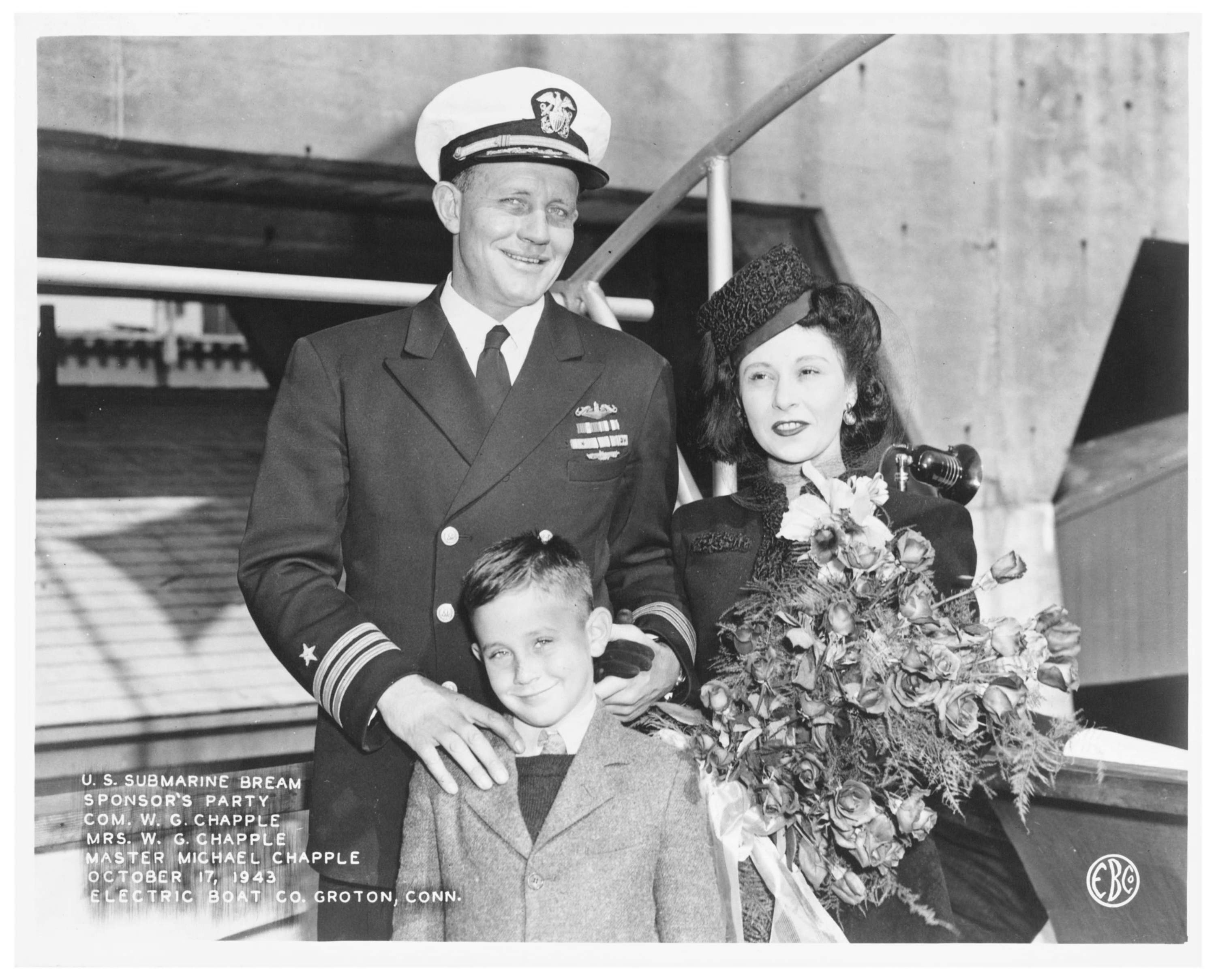528k | Bream (SS-243) sponsors party: COM. Wreford G. Chapple, Mrs. Wreford G. Chapple, & Master Michael Chapple, 17 October 1943. | Electric Boat / USN photo courtesy of Wendy S. Gulley, Archivist, Submarine Force Museum, Naval Submarine Base NLON, Groton, CT. | |