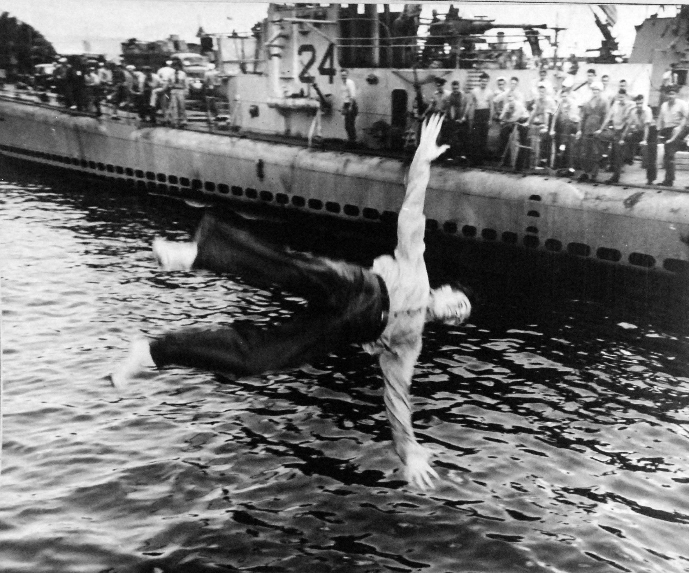 ![]() | 528k | In true Navy tradition, shipmates of John O. Tibs toss him overboard from Bream (SS-243) at Pearl Harbor, Territory of Hawaii, on the occasion of his promotion to Chief Machinist's Mate, 15 June 1945. Note the unidentified sub # 24 in the background. This boat is a Government built Gato with a Mod 4 fairwater. I would place the date around the spring/summer of 1944. I believe the location to be Pearl Harbor or Midway. The two digit number was a temporary number assigned to boats doing local workups prior to departing on patrol. They changed often and were sometimes reused. I have seen it exclusively (so far) on boats in Hawaiian waters. The boat also has a 40mm mount on the aft gun deck and a Mk 10 open mount for a 20mm on the forward gun deck. There appears to be a Mod 3 Gato or a Balao/Tench moored behind it. | Text i.d. courtesy of David Johnston (USN, retired) Photograph # 80-G-495544, by Photographer's Mate First Class L. Strawger, now in the collections of the National Archives, courtesy of National Museum of the U.S. Navy via flickr.com. |