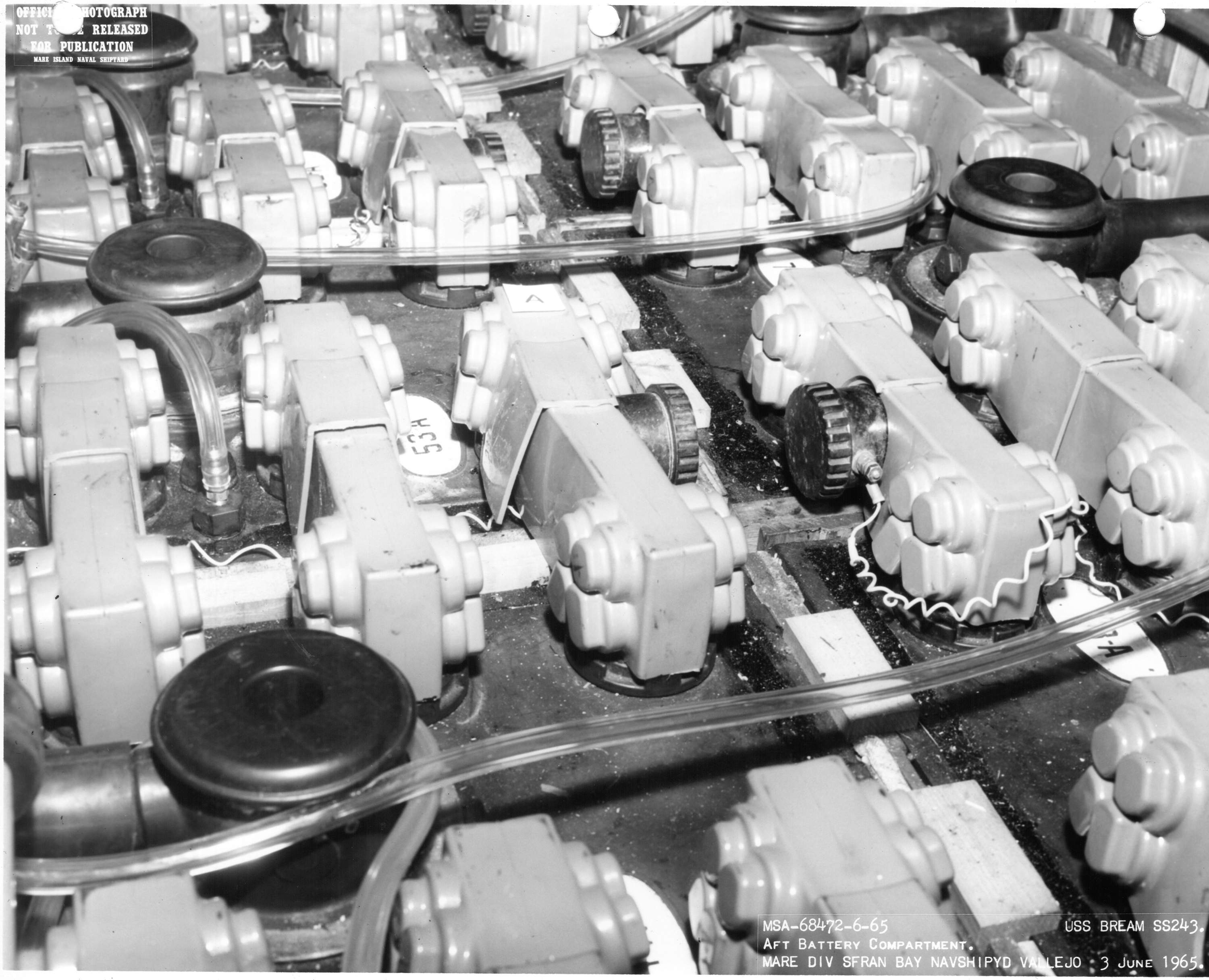 ![]() | 489k | General view of the forward battery compartment aboard the Bream (AGSS-243) at Mare Island on 3 June 1965. Bream was under repairs at Mare Island from 10 February 1965 and 30 June 1965. | US Navy Photo # 68472-6-65 courtesy of the Vallejo Naval & Historical Museum via Darryl L. Baker. | |