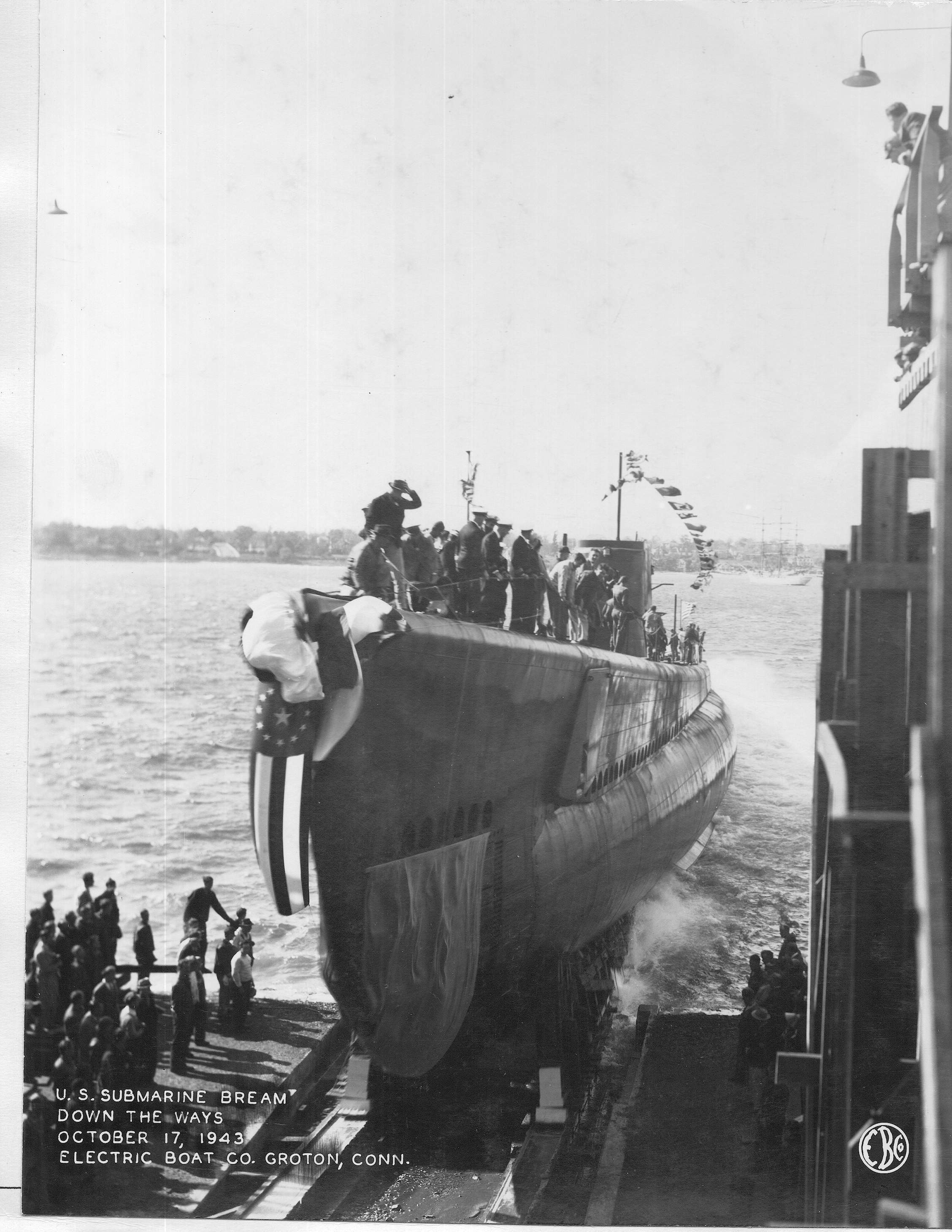 3.01k | The Bream (SS-243) was sponsored by Mrs. Wreford G. Chapple, wife of the prospective commanding officer. | Electric Boat / USN photo courtesy of Wendy S. Gulley, Archivist, Submarine Force Museum, Naval Submarine Base NLON, Groton, CT. | |