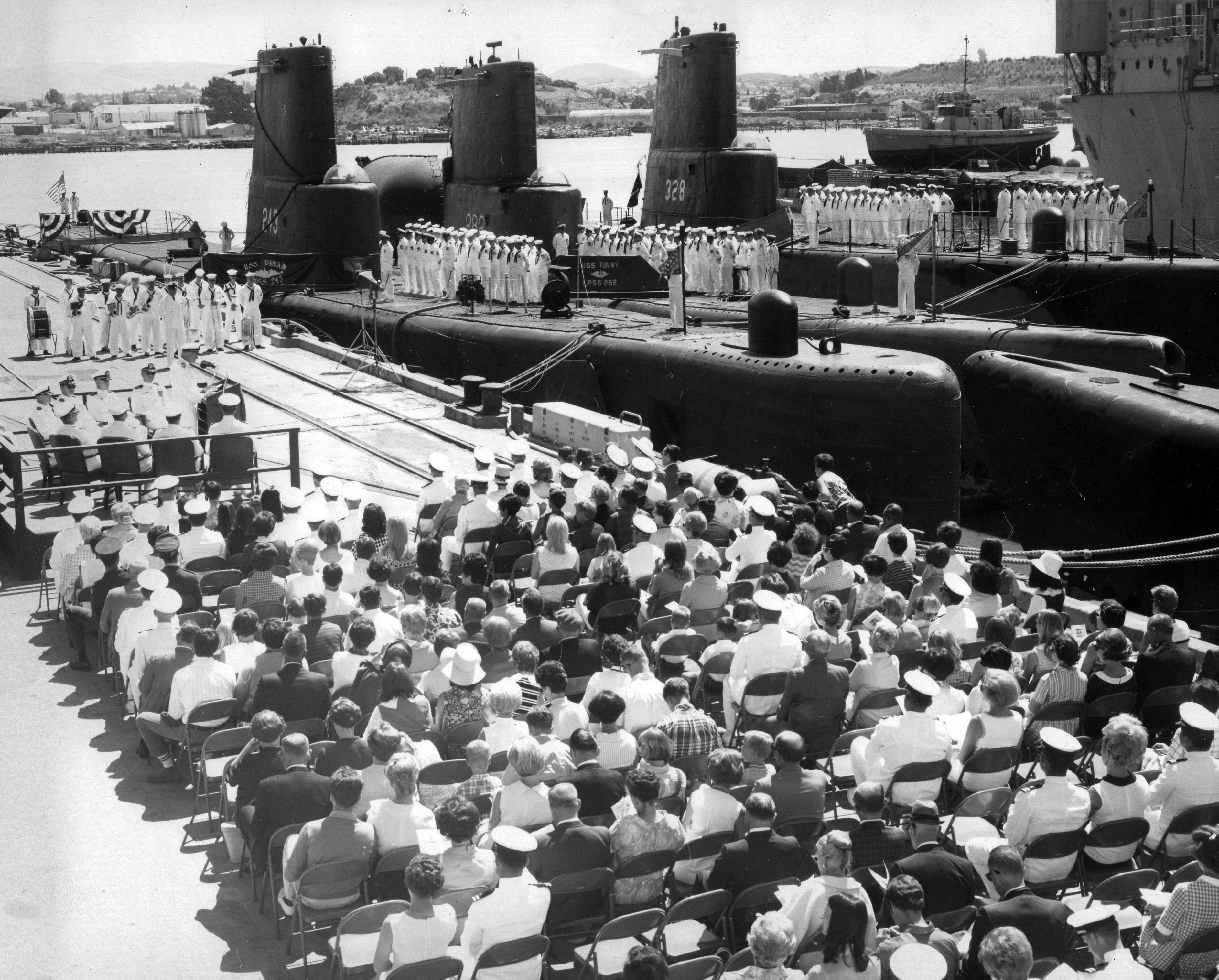 ![]() | 1.10k | Bream (AGSS-243), Tunny (AGS-282) and Charr (AGSS-328), during the decommissioning ceremony at Mare Island on 28 June 1969. | Photo courtesy of the Vallejo Naval and Historical Museum via Darryl L. Baker. | |