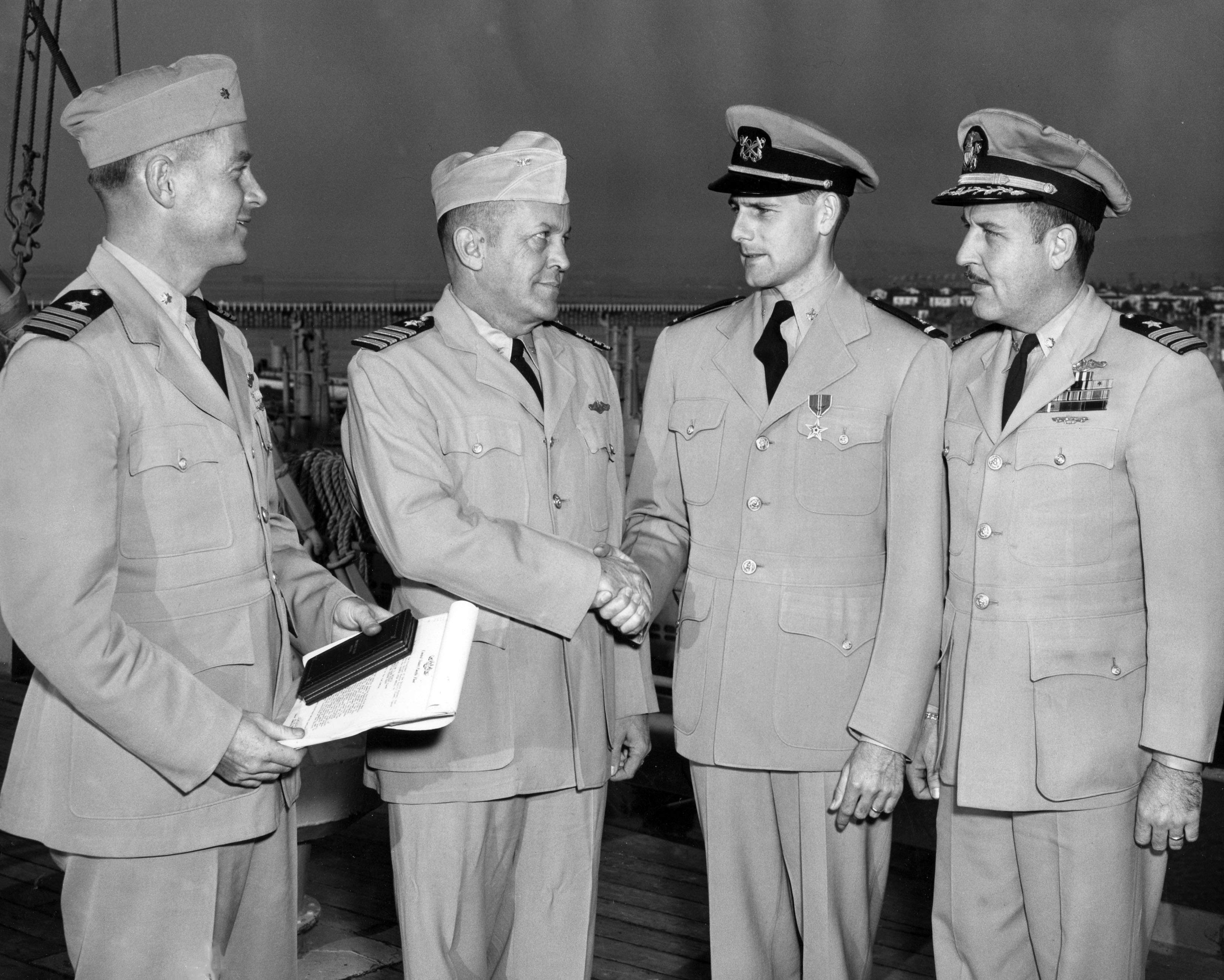 ![]() | 839k | Boatswain William R. Leibold was presented the Bronze Star for the period covering 22 January to 3 March 1944 while attached to the Tang (SS-306). Ceremony was held aboard the Pelias (AS-14) at Mare Island on 14 November 1947. Left to right: CDR Richard H. O'Kane (Chief Staff Officer, Mare Island Group, Pacific Reserve Fleet & Commanding Officer of Tang during the period of the award); Capt. H. C. Fish (Commander, Mare Island Group), Boatswain Leibold and CDR J. L. P. McCallum (Planning Officer, Mare Island Group). BTW CDR J. L. P McCallum was CO of the Bream (SS-243) in late 1944. | USN photo courtesy of the Vallejo Naval & Historical Museum via Darryl L. Baker. | |