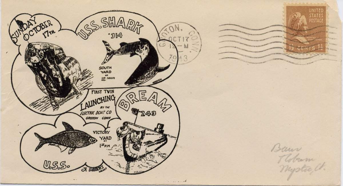 90k | Postal cover marking the launching of the Shark (SS-314) from the South Yard of Electric Boat Company and the launching of the Bream (SS-243) at Electric Boat's Victory Yard on 17 October 1943. | Courtesy of Darryl L. Baker. | |