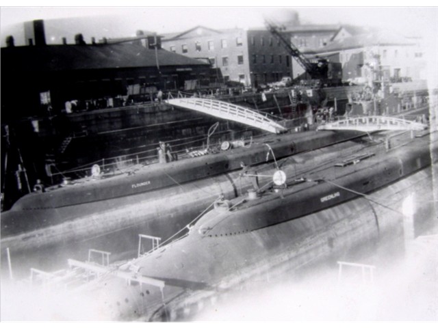 62k | Postwar photo of the Greenling (SS-213) & Flounder (SS-251). | Photo courtesy of F.A. Knittle & Tami Murphree. | |