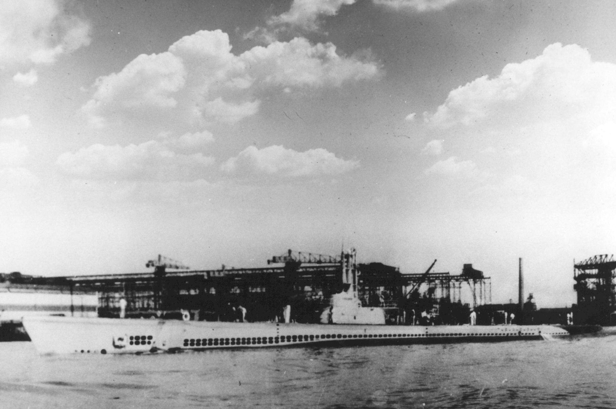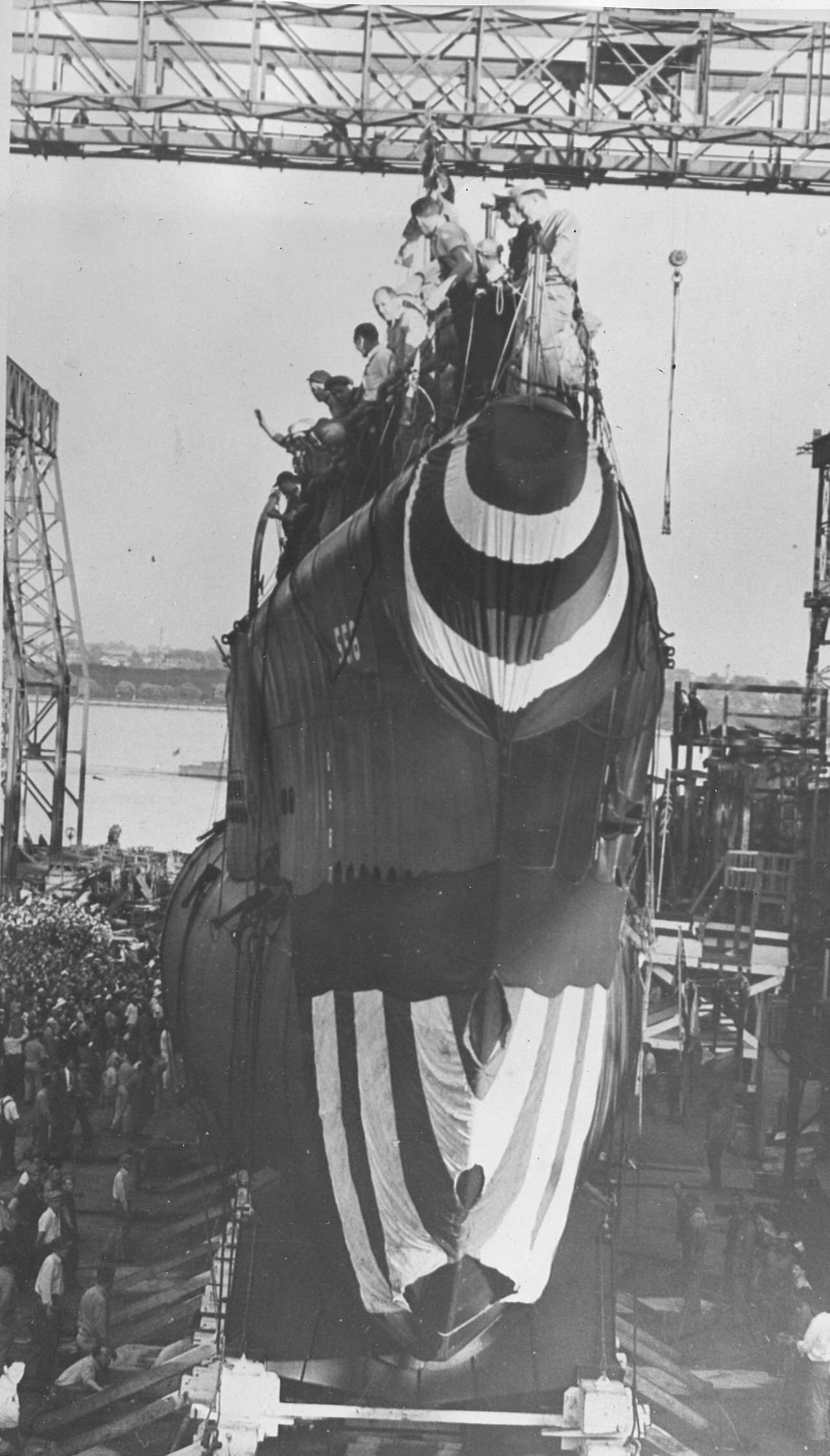 415k | Number 556 adorns the sides of the Roncador (SS-301) shortly before lauching at Cramp Shipbuilding Corp., Philadelphia, PA., 14 May 1944. The numbers on their side are undoubtedly an internal construction number used by Cramp. Simon Lake also used in-house numbers on his O & R class boats while they were still in his yard. In the case of Cramp, the use of these numbers appears to be limited. Not all of the launch photos for their boats show the numbers. Being a late comer in the sub construction business, Cramp had tremendous problems in hiring skilled workers. Most of the good ones had already been hired by other firms in the rapidly expanding war economy. Putting these numbers on these boats may have been a way of keeping things from getting mixed up. This was a very rare occurrence. To my knowledge, none of the other building yards (EB, Ports, MI, Man, or Boston) placed internal hull numbers on the boats during the war. I think it was just easier to use the hull number that was assigned by the Navy. | International News photo courtesy of David Buell. Photo I.d. & text courtesy of John Hart, Ric Hedman, & David Johnston | |