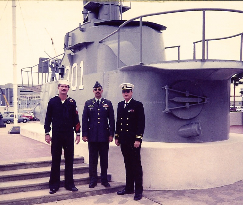 553k | March 1994 - AET1 James J. Scott, USN(RET), WO4 John Harris USANG (Army Aviation - Helicopter Pilot), LT R.J. Hansen, USNR - Former TM2(SS) - Sub Base San Diego Memorial. All three above trained on the Roncador (AGSS-301) as U.S. Naval Sea Cadets 1967-1968. | Photo courtesy of LTJG R.J. Hansen, USNR. | |