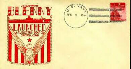 ![]() | 75k | Commemorative post mark on the occasion of Blenny's (SS-324) launching at Electric Boat Company, Groton, CT., 9 April 1944. | USN photo courtesy of Scott Koen & ussnewyork.com. | |