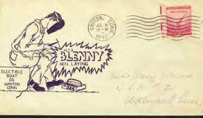 ![]() | 175k | Commemorative post mark on the occasion of Blenny's (SS-324) keel laying, 8 July 1943, at Electric Boat Company, Groton, CT. | USN photo courtesy of Scott Koen & ussnewyork.com. | |
