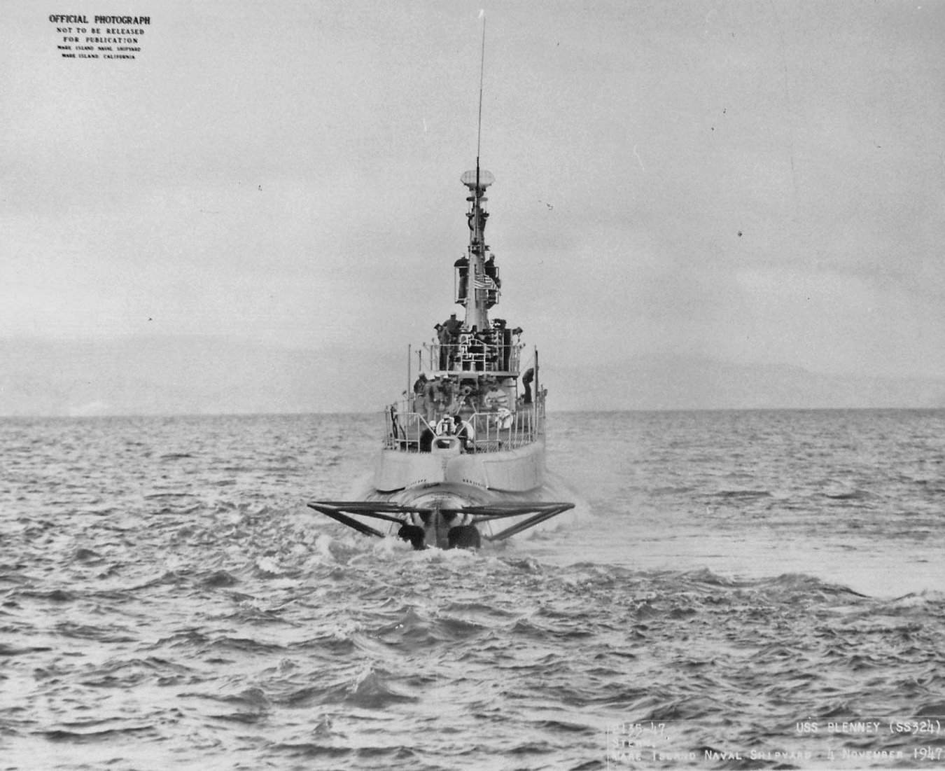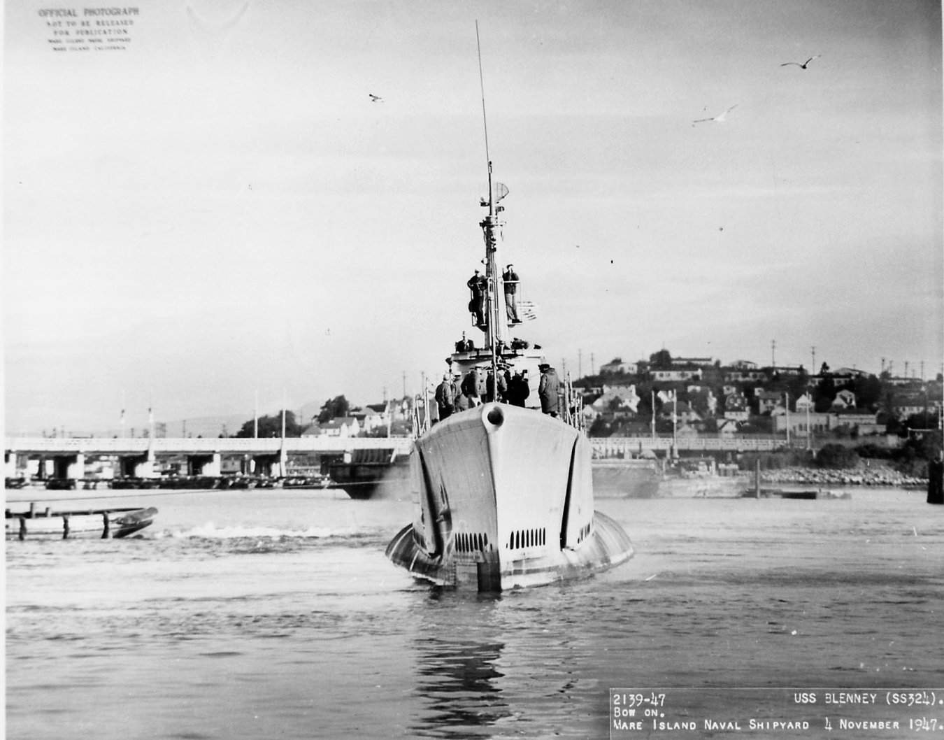 ![]() | 103k | Bow on view of Blenny (SS-324)in the Mare Island channel departing the yard on 4 November 1947. | USN photo # 2139-47, courtesy of Darryl L. Baker. | |