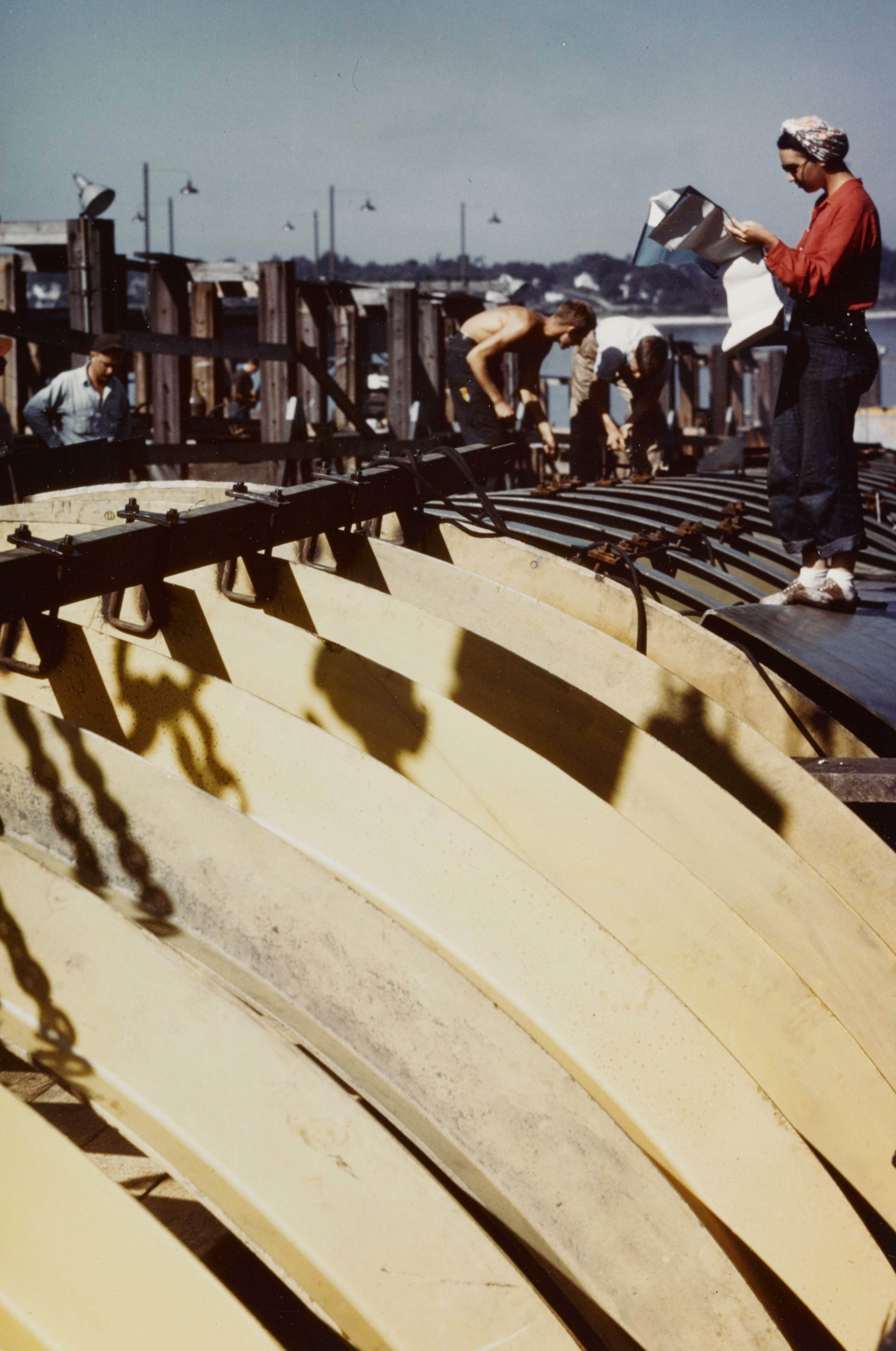 ![]() 0832410 | 1.19k | A woman shipyard worker studies a blueprint atop the hull frames of Blenny (SS-324), circa summer 1943. | Photographed by Commander Edward Steichen, USNR. USN photo # 80-G-K-15065 courtesy of Naval History and Heritage Command |