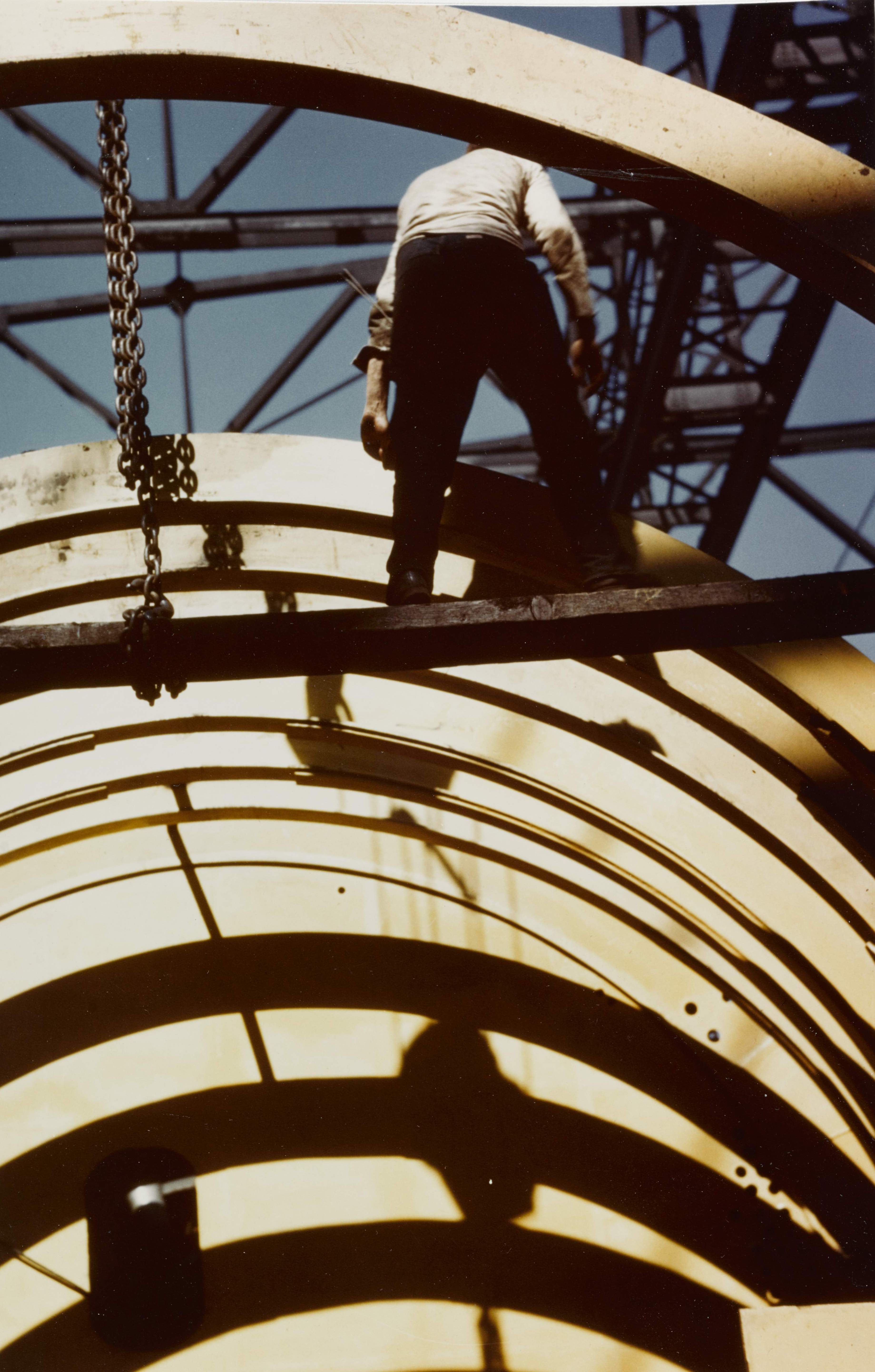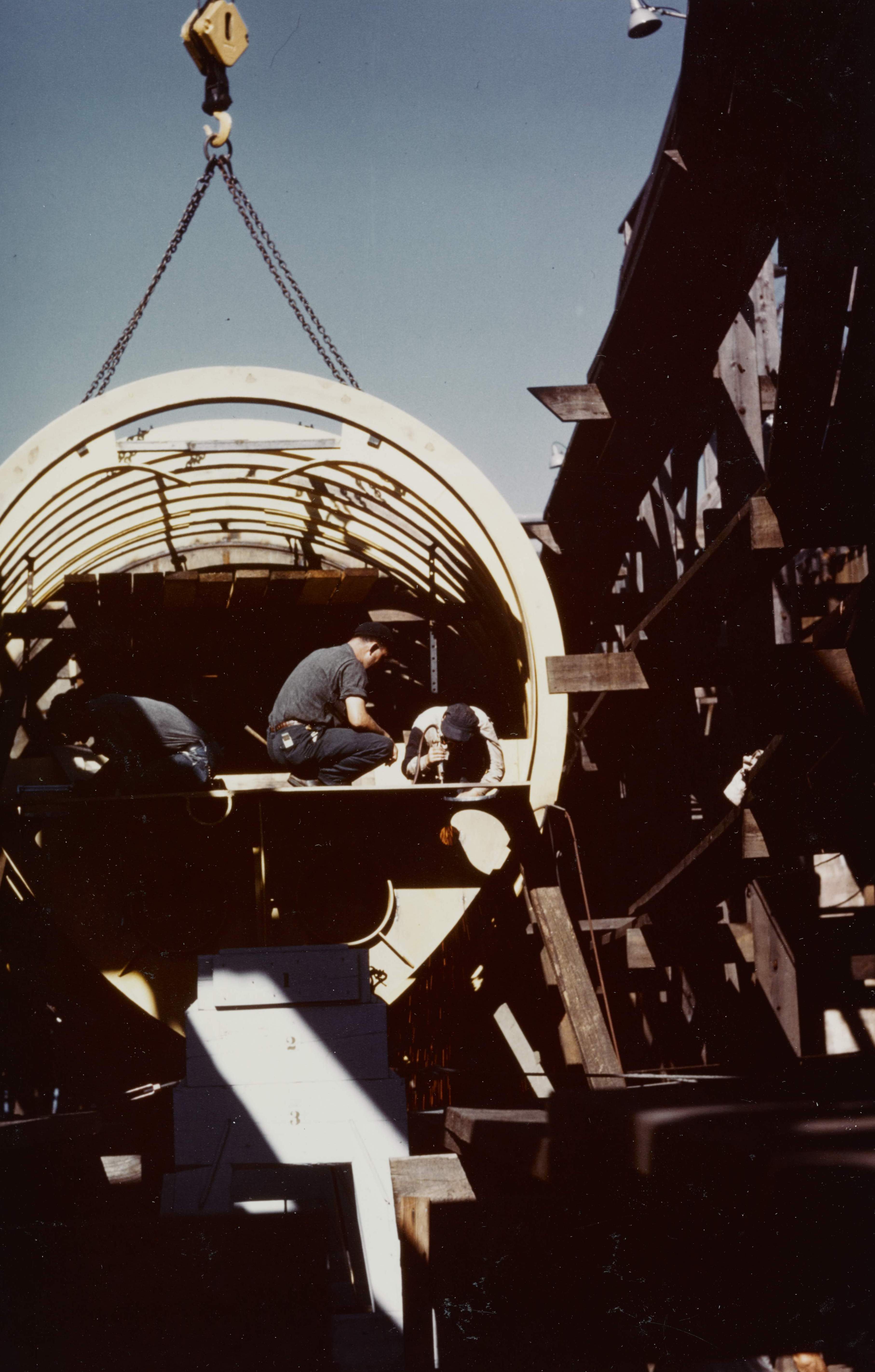 ![]() 0832429 | 1.03k | Workman guides crane operator as a hull section is lowered into place on the submarine's building way, circa summer 1943. | Photographed by Commander Edward Steichen, USNR. USN photo # 80-G-K-15089 courtesy of Naval History and Heritage Command |