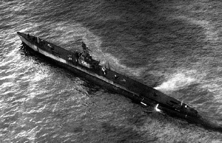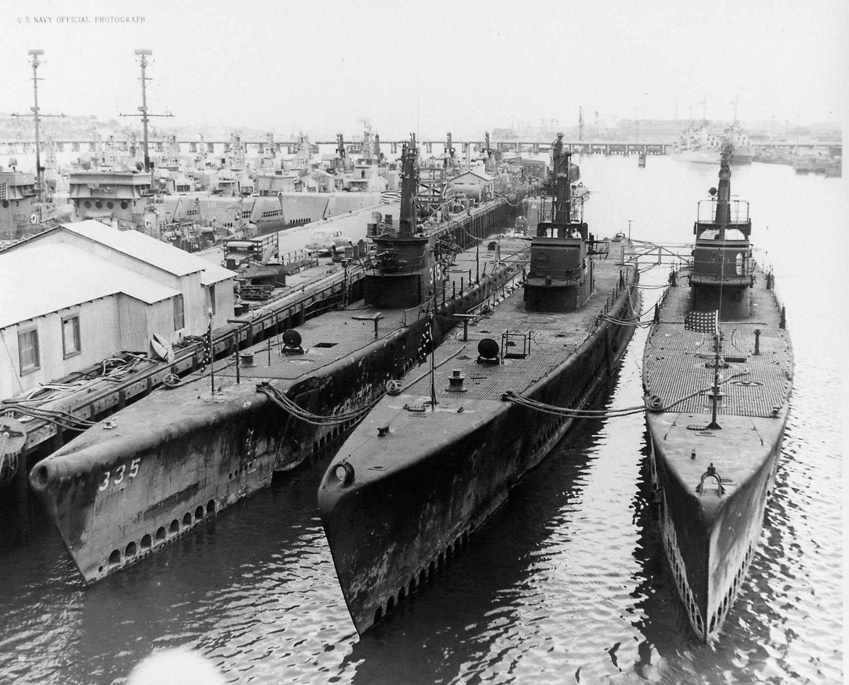 285k | Admiral's farewell. Taking command as CinCPac in January 1942, Admiral Nimitz raised his flag on the Grayling (SS-209). He relinquishes command (scene above) boarding the Menhaden (SS-377) to haul down his flag on 24 November 1945. The Dentuda (SS-335) is on the other side of the wharf. The ship at the end of the pier is the Begor (APD-127). Note: Quite a few people participated in trying to identify the Dentuda. Special thanks go to Ira M. King for finally identifying the boat, Dave Carpenter, Les Guille, Dave McClintock Jr., Jim Clepper, O.H. Wright & Dave Johnston (USNR).& Darryl L. Baker. & Aryeh Wetherhorn. |