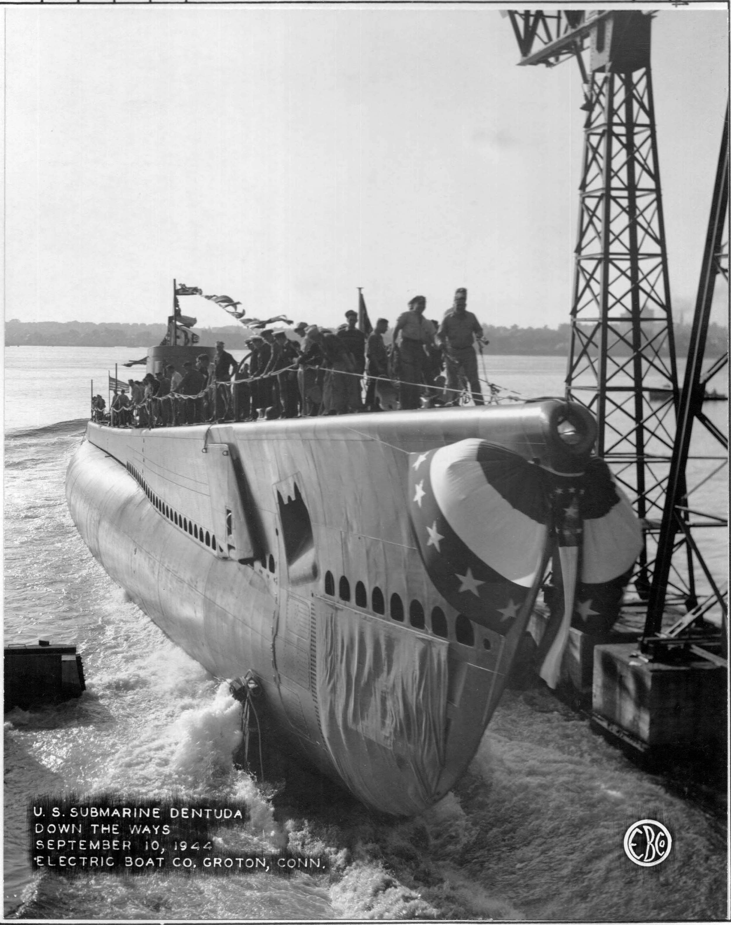 632k | Dentuda (SS-335) slides down the launching ways at the Electric Boat Company, Groton, CT., 10 September 1944. | USN photo # 80-G-448207 from National Archives and Records Administration (NARA), College Park, Maryland, courtesy of Sean Hert. | |
