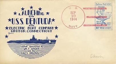 19k | Commemorative post mark on the occasion of Dentuda's (SS-335) launching at the Electric Boat Company, Groton, CT., 10 September 1944. | Courtesy of Jack Treutle (of blessed memory). | |