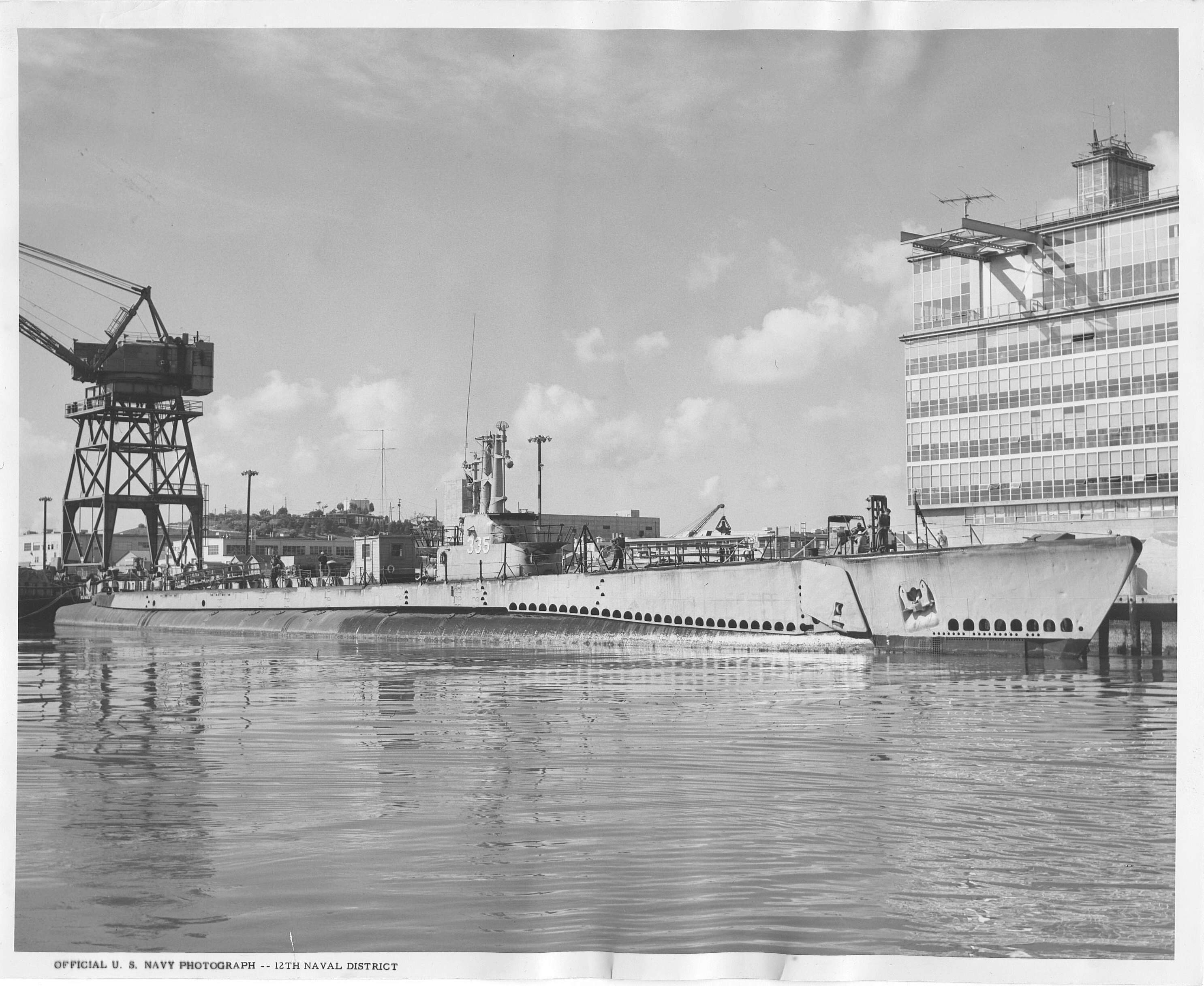 262k | Portside view of the Dentuda (SS-335) pulling into Hunters Point 1946. | Courtesy of John Hummel & Robert Hurst. | |
