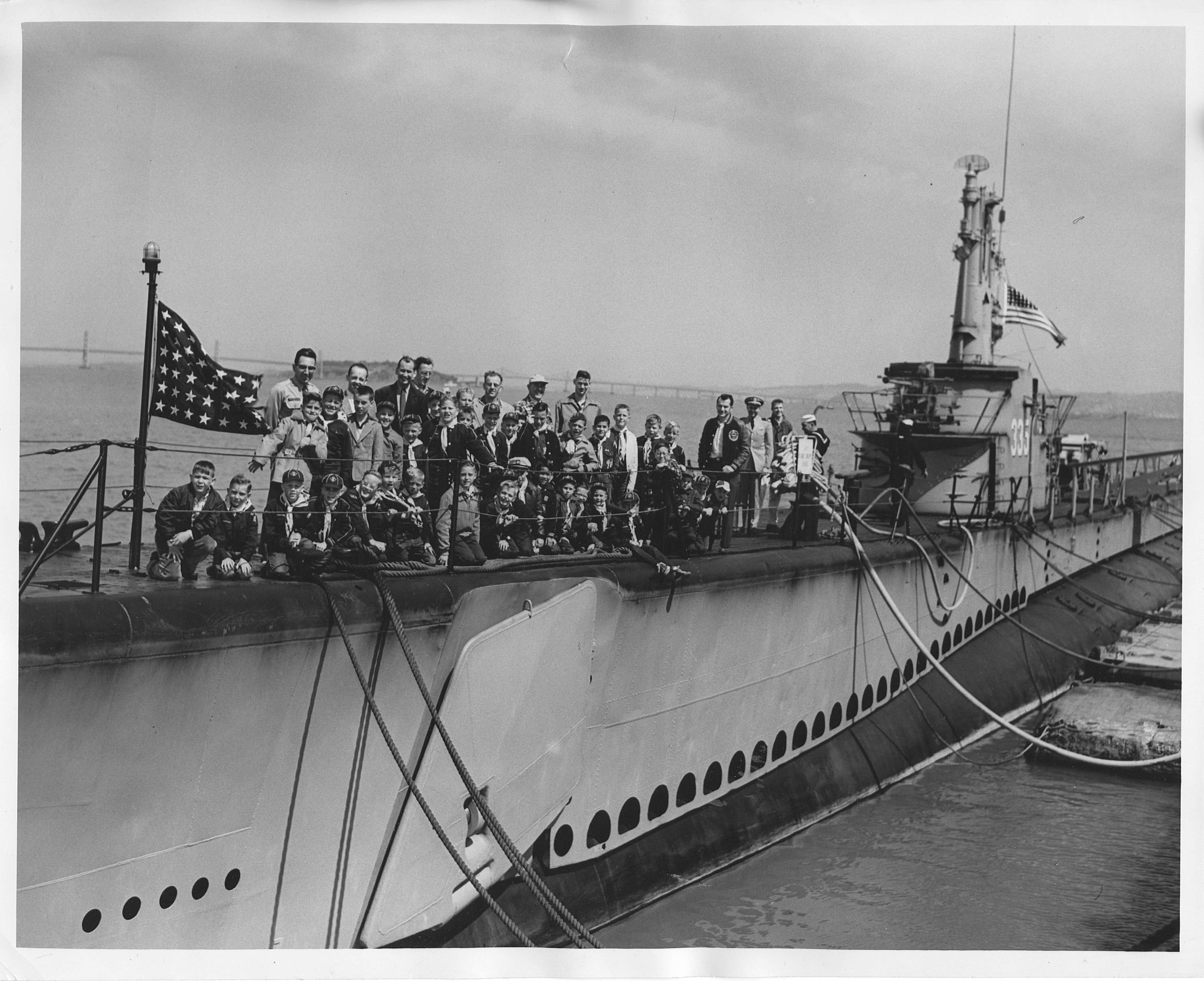 598k | "San Bruno Cub Scout Pack 72 poses for this group picture on the bow of the submarine, Dentuda (SS-335) following a tour of the "boat" during their visit to San Francisco Naval Shipyard, Saturday 16 April '55. The boys also were taken on a motor tour of the entire shipyard and shown the newest film of the submarine service". | USN photo from the 12th Naval District, courtesy of David Buell. | |